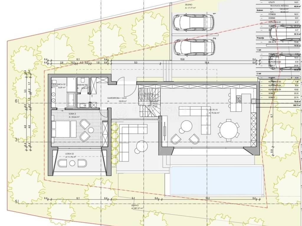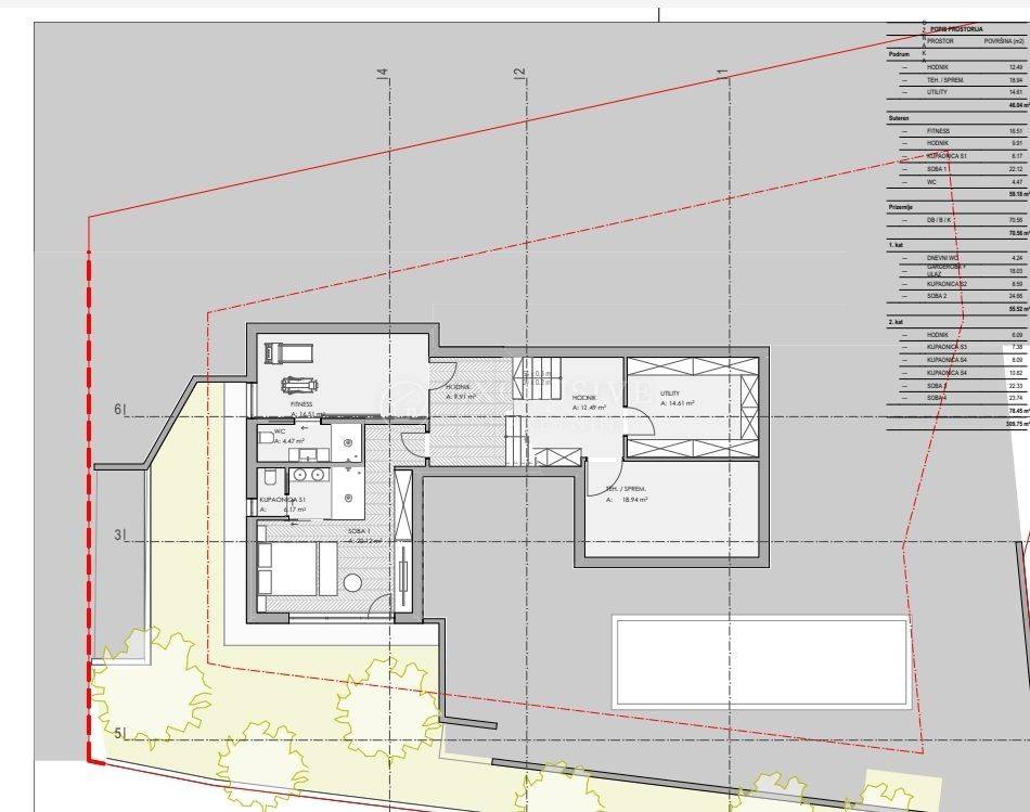 Zemljište se prodaje s projektom za samostojeću vilu S+P+1+2, bruto površine 370m2 i s infinity bazenom.