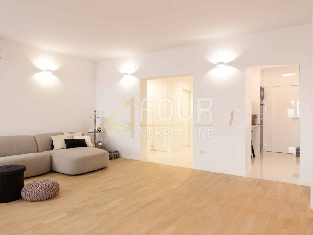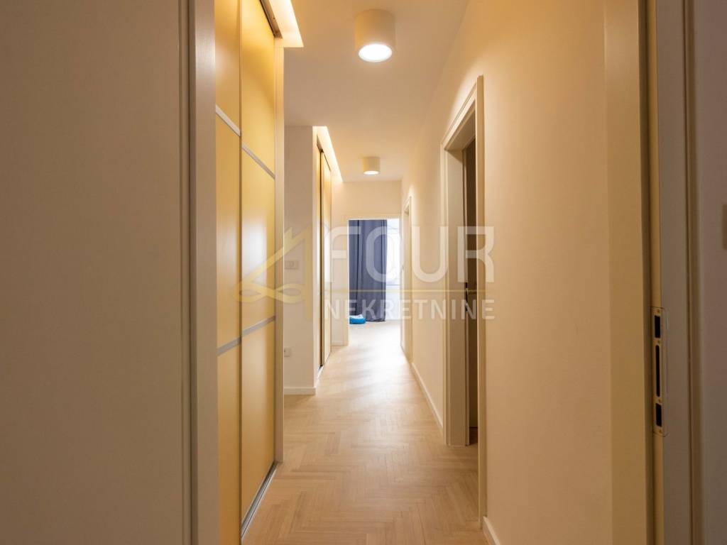 The apartment has a luxurious 147m2 area, a 3-bedroom + living room layout, and has a large living room, a separate kitchen with a pantry, two luxuriously renovated bathrooms, one of which is en-suite, and two balconies, one of which is 20 m2 with a panoramic view. The hallways and rooms are equipped with built-in wardrobes, and underfloor heating extends across all ceramic surfaces. Each room is equipped with a Mitsubishi air conditioner.