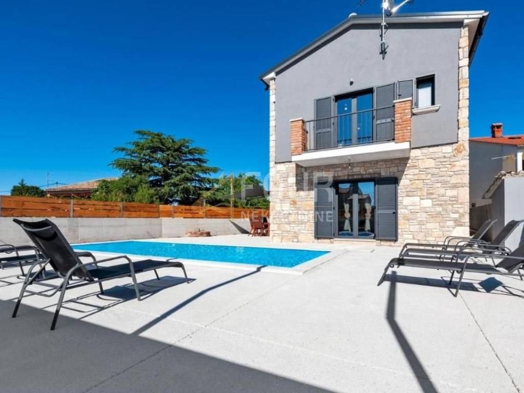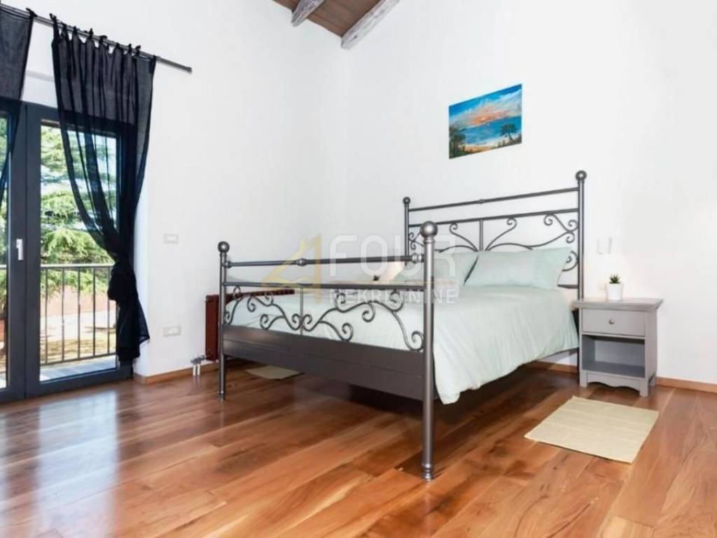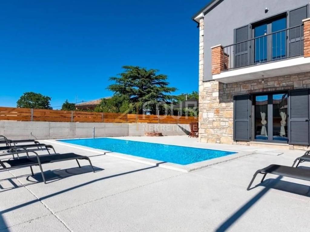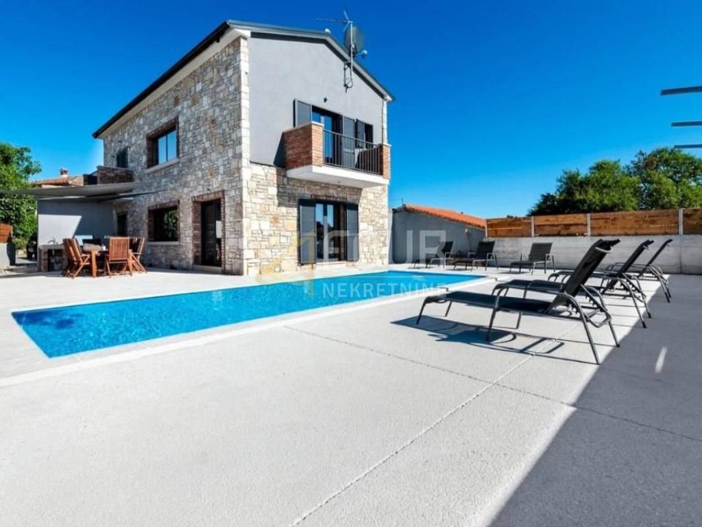 For sale is a luxurious villa of 240m2 with a swimming pool in the heart of Istria. It is very well built, designed as a two-story apartment. On the ground floor there is a kitchen with a dining room and a living room with a fireplace and access to the garden/swimming pool and a bedroom with its own bathroom. On the first floor there are two bedrooms with bathrooms and terraces. One bedroom and a gallery that is furnished with two additional beds. On the 500m2 garden there is a 30m2 swimming pool with salt water and a hydromassage bench, a sundeck, a summer kitchen with an old stone sink, a gas grill, an outdoor shower and 4 parking spaces. It is located in a quiet location and only 15 km from the sea and the pearl of Istria - Rovinj.