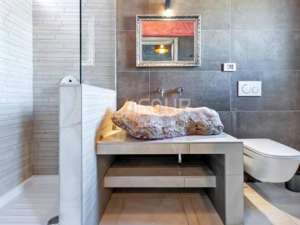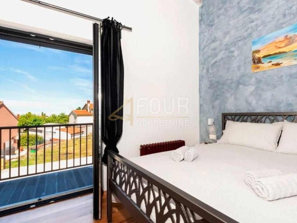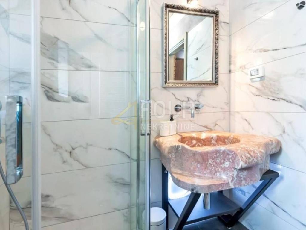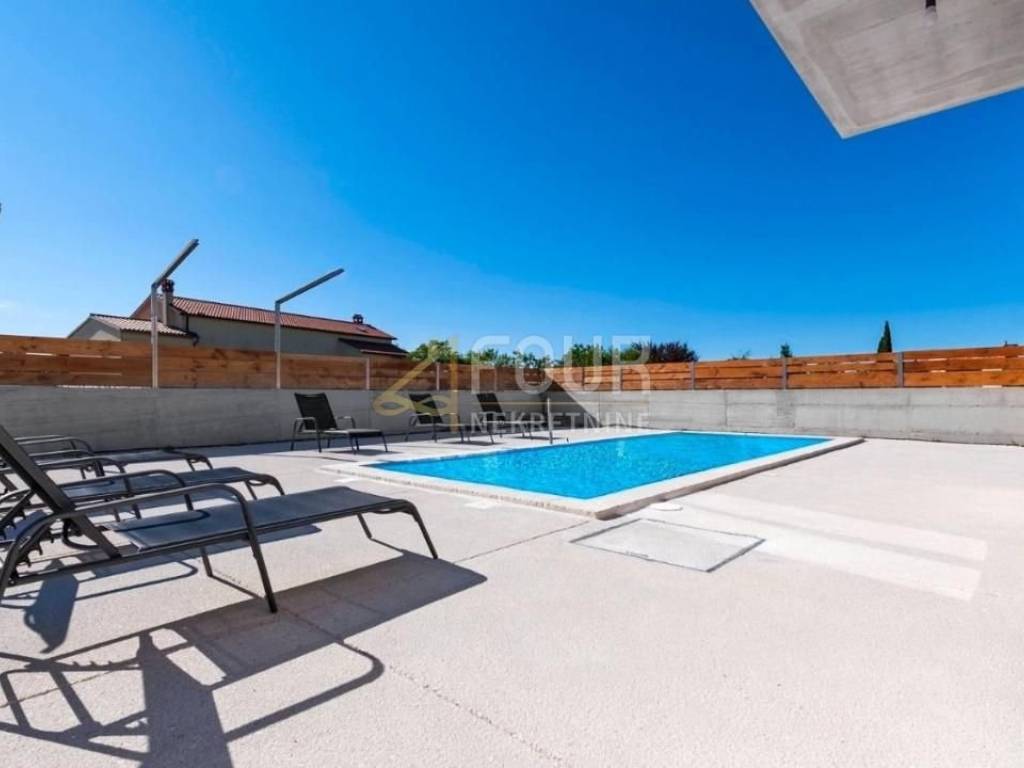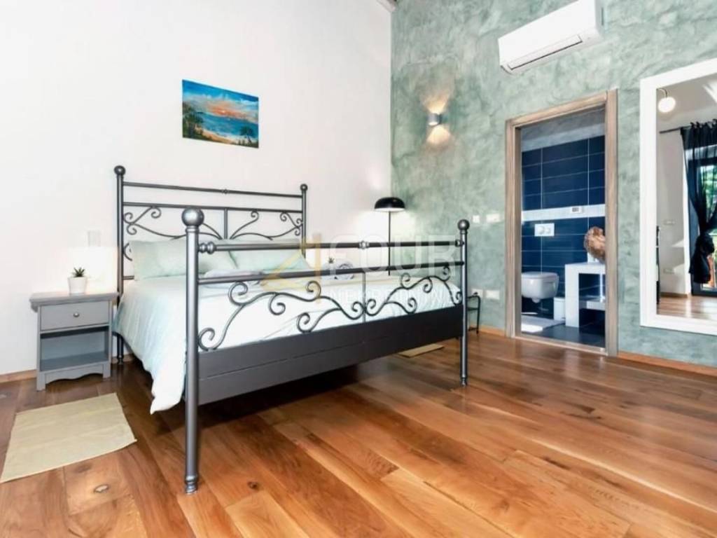 For sale is a luxurious villa of 240m2 with a swimming pool in the heart of Istria. It is very well built, designed as a two-story apartment. On the ground floor there is a kitchen with a dining room and a living room with a fireplace and access to the garden/swimming pool and a bedroom with its own bathroom. On the first floor there are two bedrooms with bathrooms and terraces. One bedroom and a gallery that is furnished with two additional beds. On the 500m2 garden there is a 30m2 swimming pool with salt water and a hydromassage bench, a sundeck, a summer kitchen with an old stone sink, a gas grill, an outdoor shower and 4 parking spaces. It is located in a quiet location and only 15 km from the sea and the pearl of Istria - Rovinj.