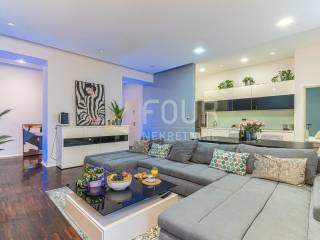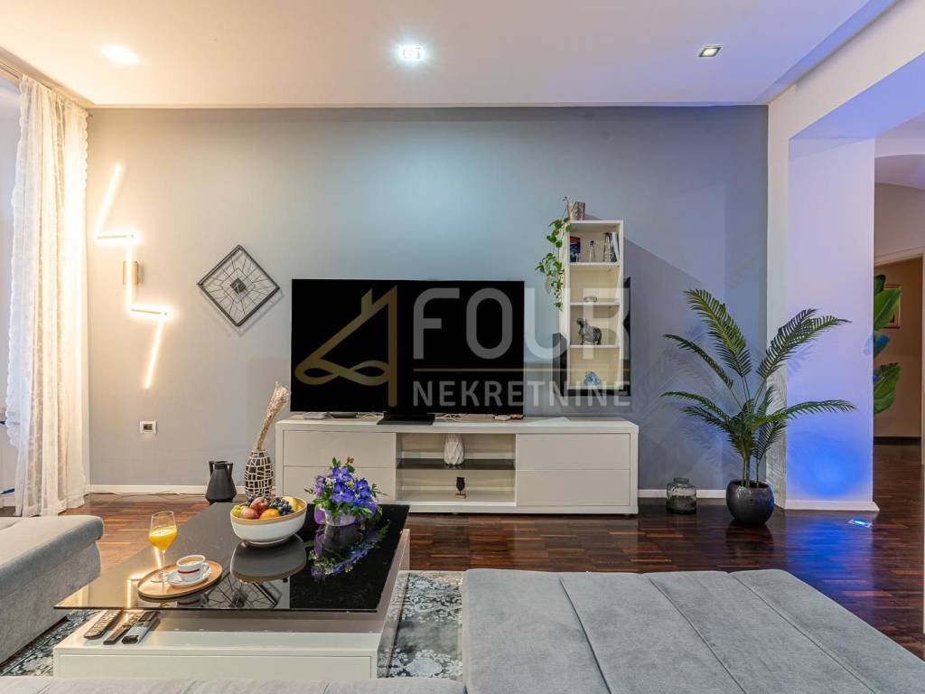 The special feature of the apartment is the master bedroom of about 30 m2, which comes with a private bathroom equipped with a massage bathtub - ideal for relaxing after a long day. The second bathroom offers additional convenience, and the apartment is fully furnished and equipped with top-of-the-line white goods. It includes two televisions, a washing machine and dryer, a dishwasher, an induction hob, a hood, an oven and a refrigerator, providing maximum functionality and style. The apartment is air-conditioned, and preparation for central heating has already been made, with installations for radiators under each window.