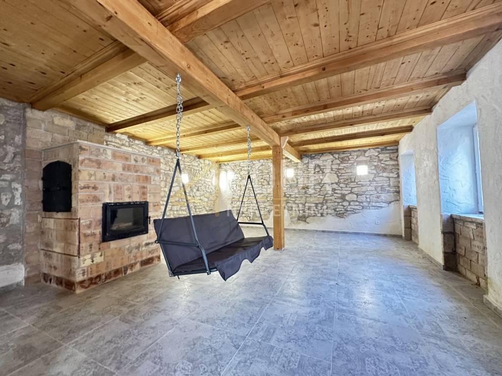 The property also includes additional spaces such as a tavern, woodshed, and cellar. It is equipped with PVC joinery, a fireplace, and a wood-burning stove.