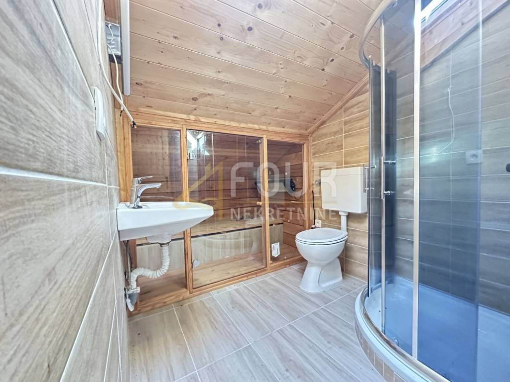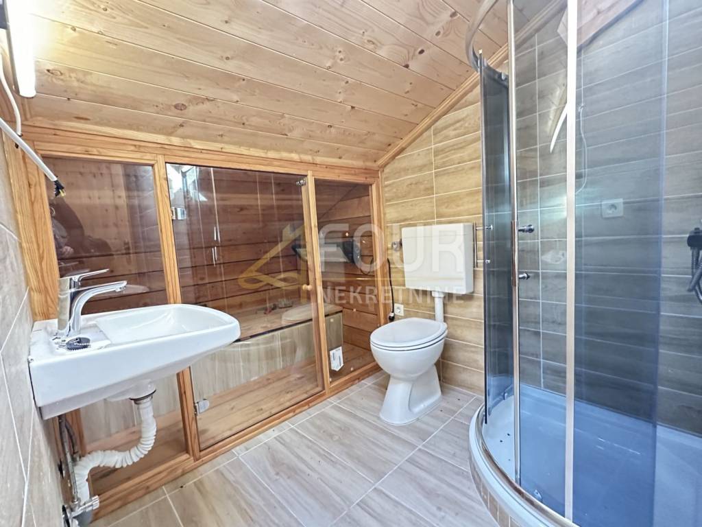 The second house, located in the courtyard, is a completely new building with living space spread across two floors. The ground floor features a spacious open-plan living room with a kitchen, dining area, and fireplace, while the upper floor consists of two bedrooms. The bathroom is equipped with an infrared sauna.