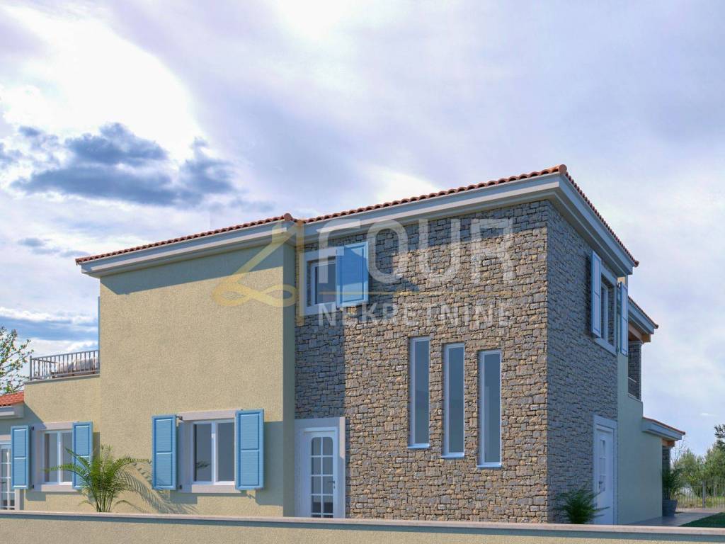 The offer is a new construction - a beautiful villa with a pool located on a plot of 635m2! It is currently in the process of construction, and the scheduled completion date is spring 2024. The villa is detached and consists of a ground floor and a first floor. Ground floor: hall, living room, kitchen with dining room, toilet, room with bathroom, playroom, laundry room and engine room. 1st floor: two spacious bedrooms with bathrooms and a terrace. Heating is on a heat pump. There is a swimming pool on the large garden and there is an automatic irrigation system.