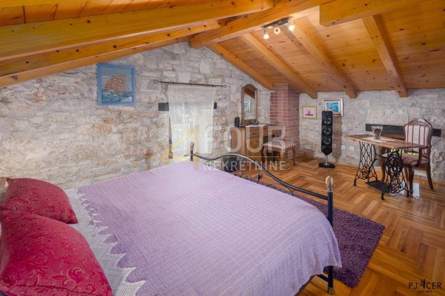 An internal staircase leads to the first floor, where there are two bedrooms, each with its own bathroom, and in the high attic, there are also two bedrooms with bathrooms.