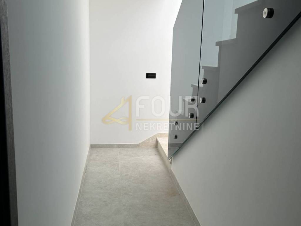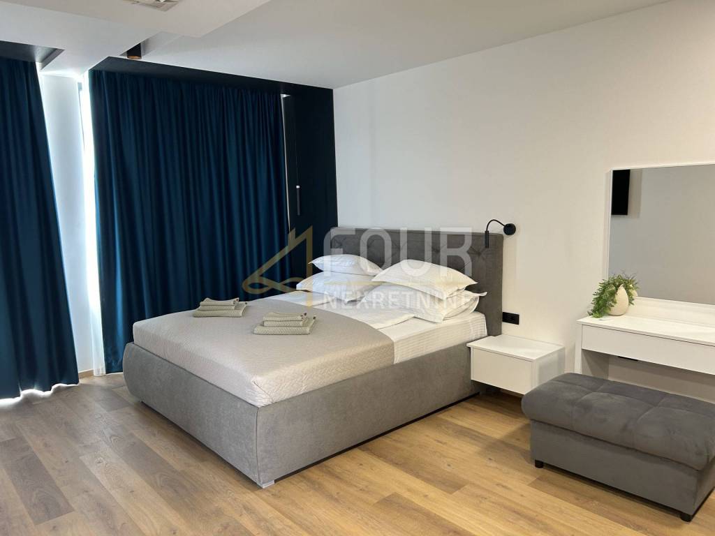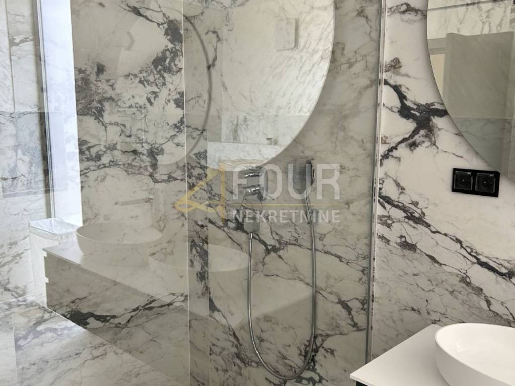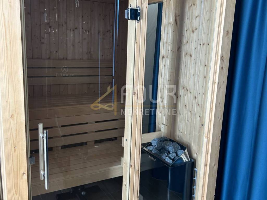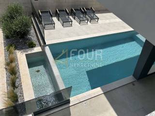 We offer a modern villa in Medulin with an area of 356 m2, near the sea with an elevator. In the basement there is a billiard room, a space for entertainment and socializing, a boiler room and a storage area of 88 m2. The ground floor consists of three rooms and three bathrooms with an area of 60 m2. On the first floor there is a living room, a kitchen with a dining room and a bathroom. On the second floor there is a room with a bathroom and a wellness area of 76 m2.