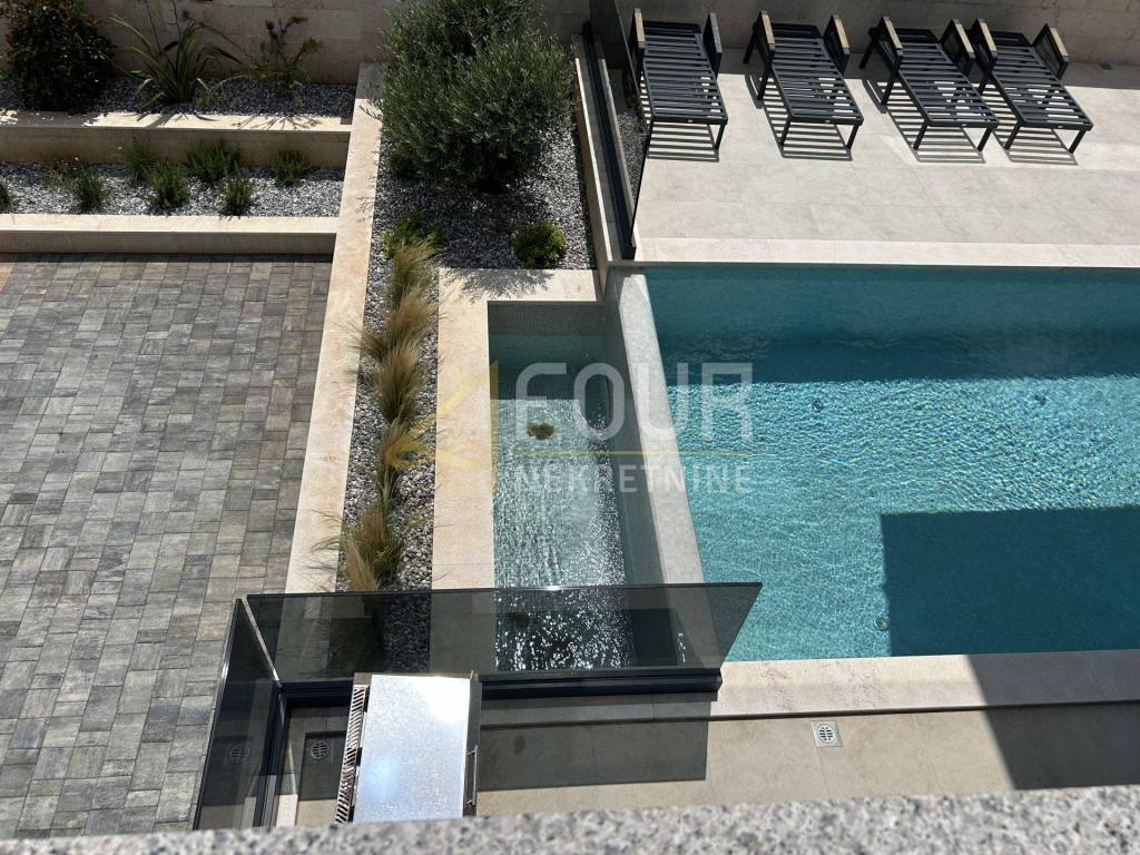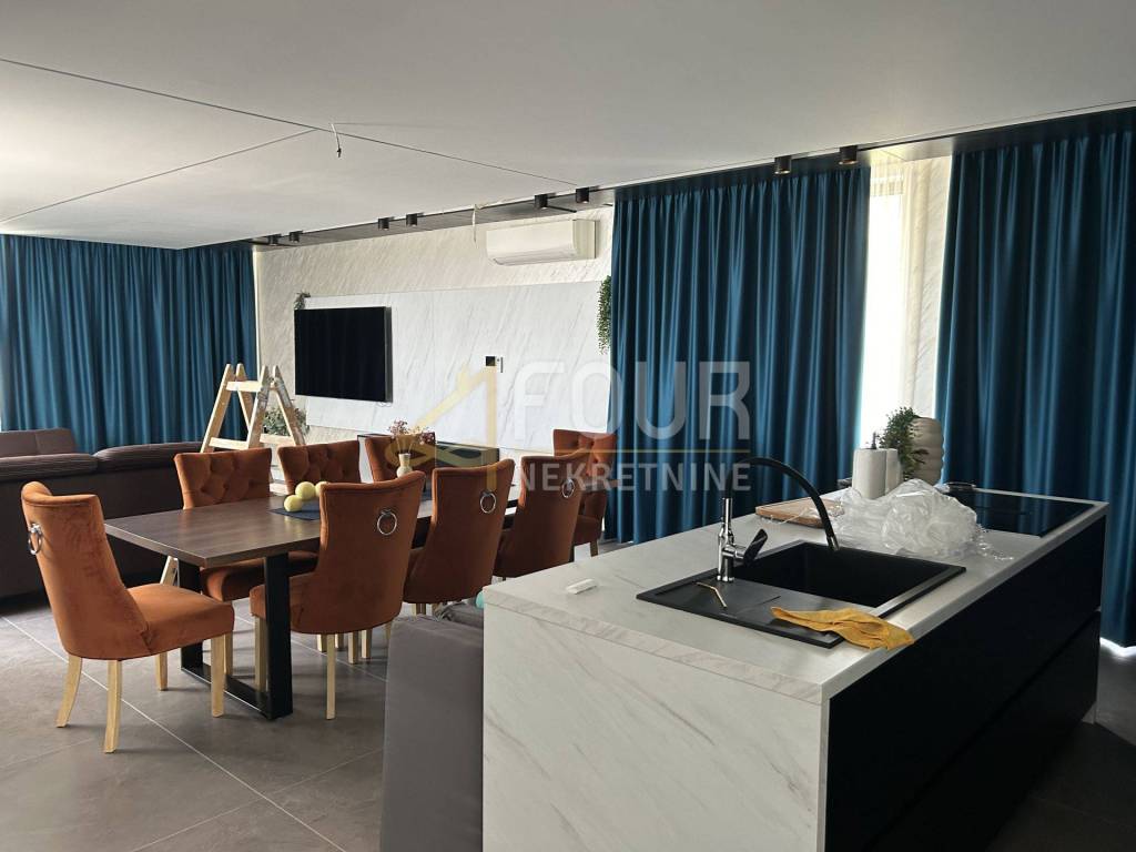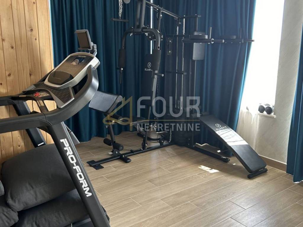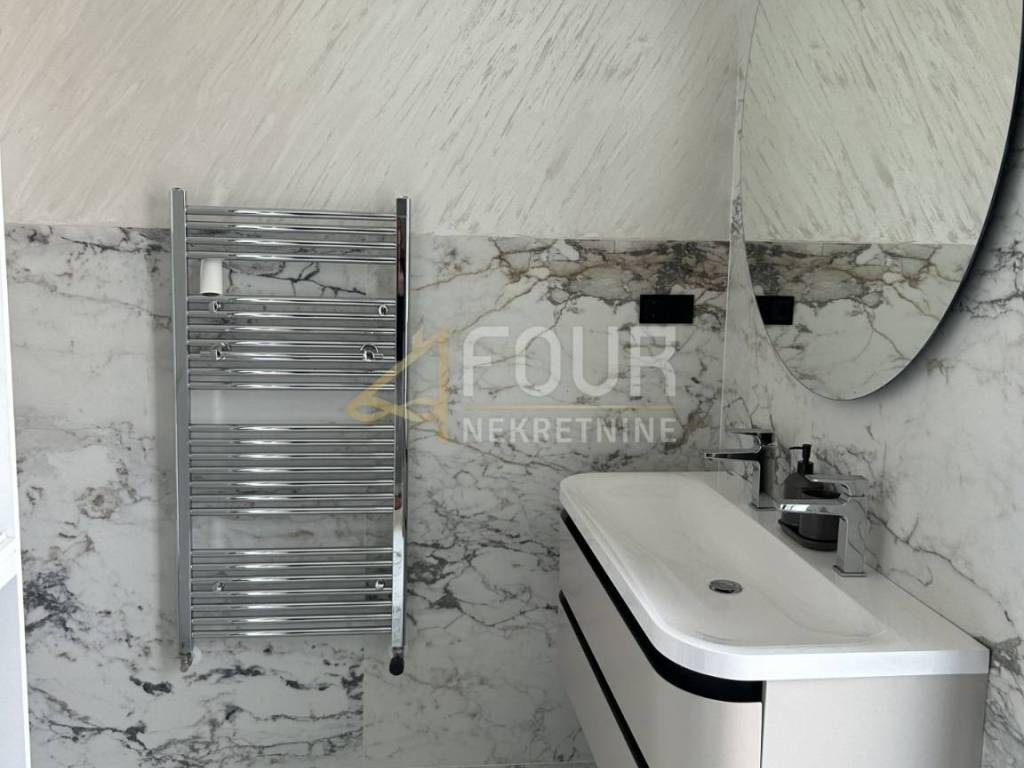 We offer a modern villa in Medulin with an area of 356 m2, near the sea with an elevator. In the basement there is a billiard room, a space for entertainment and socializing, a boiler room and a storage area of 88 m2. The ground floor consists of three rooms and three bathrooms with an area of 60 m2. On the first floor there is a living room, a kitchen with a dining room and a bathroom. On the second floor there is a room with a bathroom and a wellness area of 76 m2.