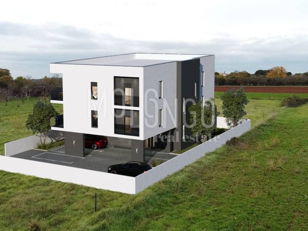 In a quiet settlement in the suburbs of Pula, 4 km from the city center, this beautiful apartment with a total living area of ​​93 m2 is for sale. The apartment is located on the first floor of a newly built residential building with only six apartments.