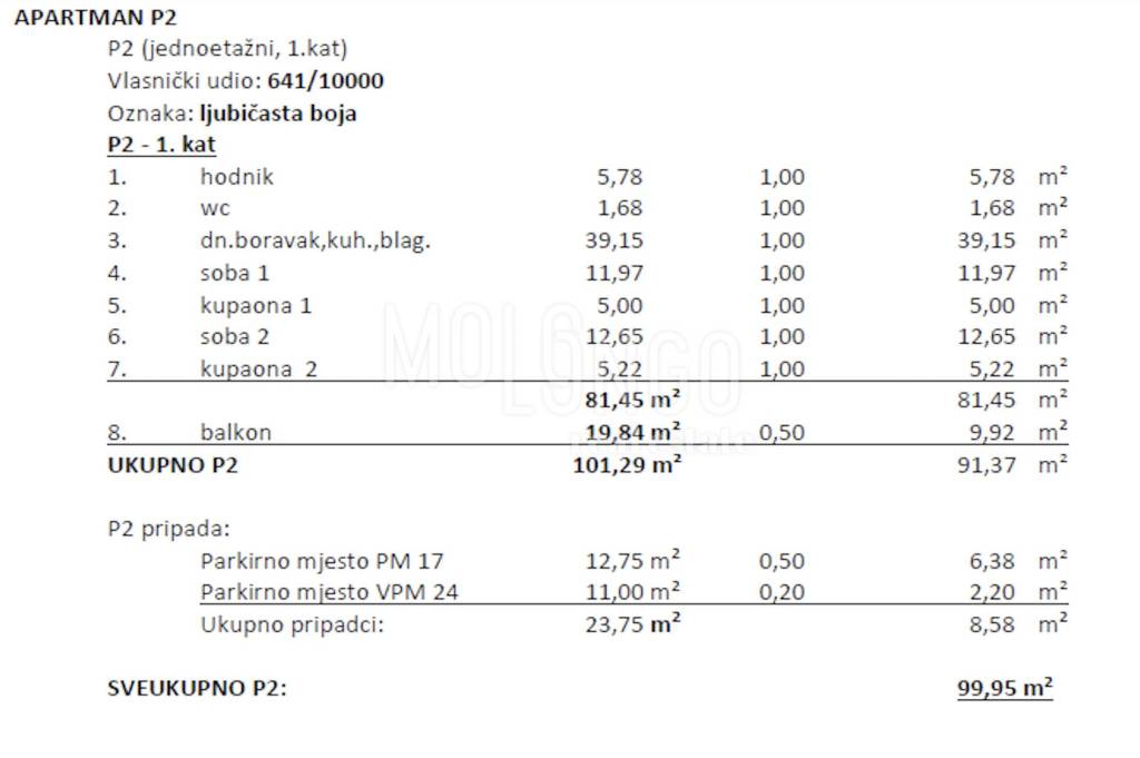 The apartment consists of a hallway, toilet, living room with kitchen and dining room, two bedrooms and two bathrooms, balcony, and one outdoor parking space and one in the underground garage.