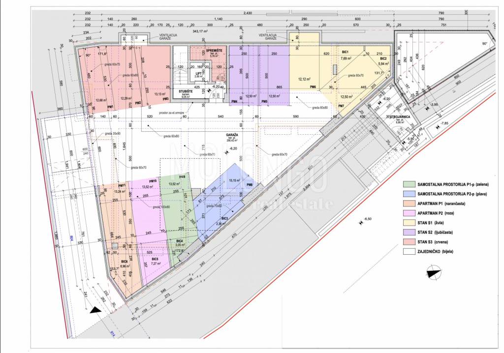 • 3 garage parking spaces: PM1 of 12.68 m2, PM2 of 12.29 m2, PM3 of 13.13 m2