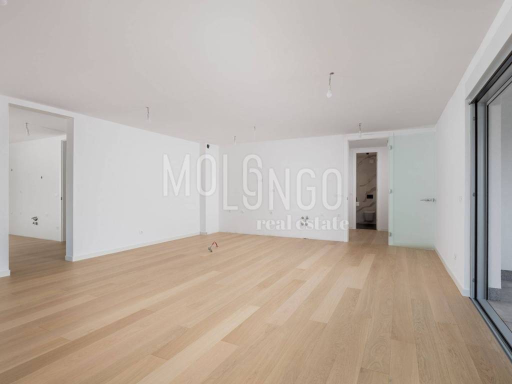 The apartment consists of a living room with a kitchen and a dining room, three bedrooms, three bathrooms, a wardrobe, a laundry room, two corridors, a toilet and appliances, and two spaces in the underground garage and one outdoors.