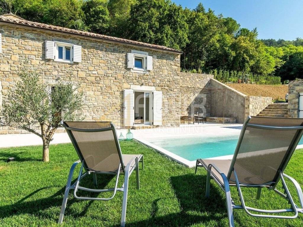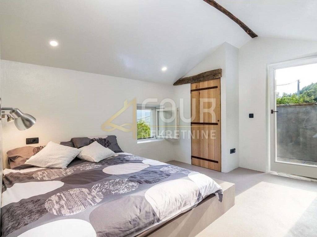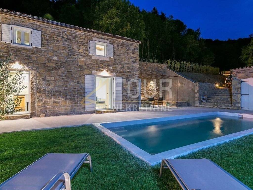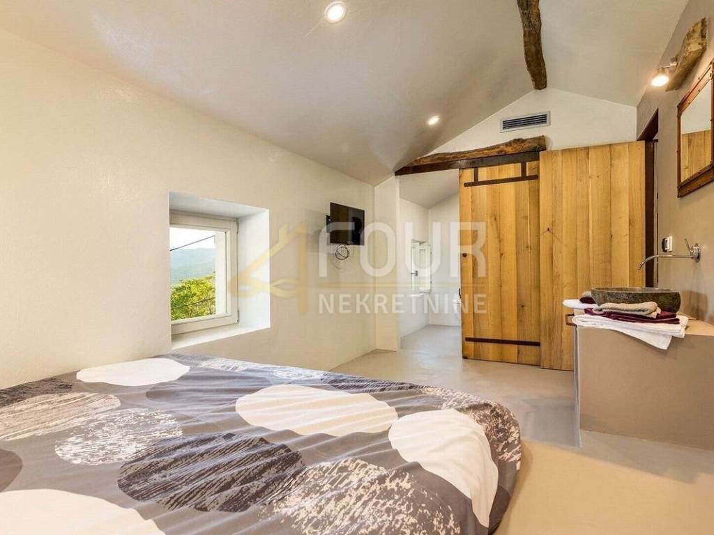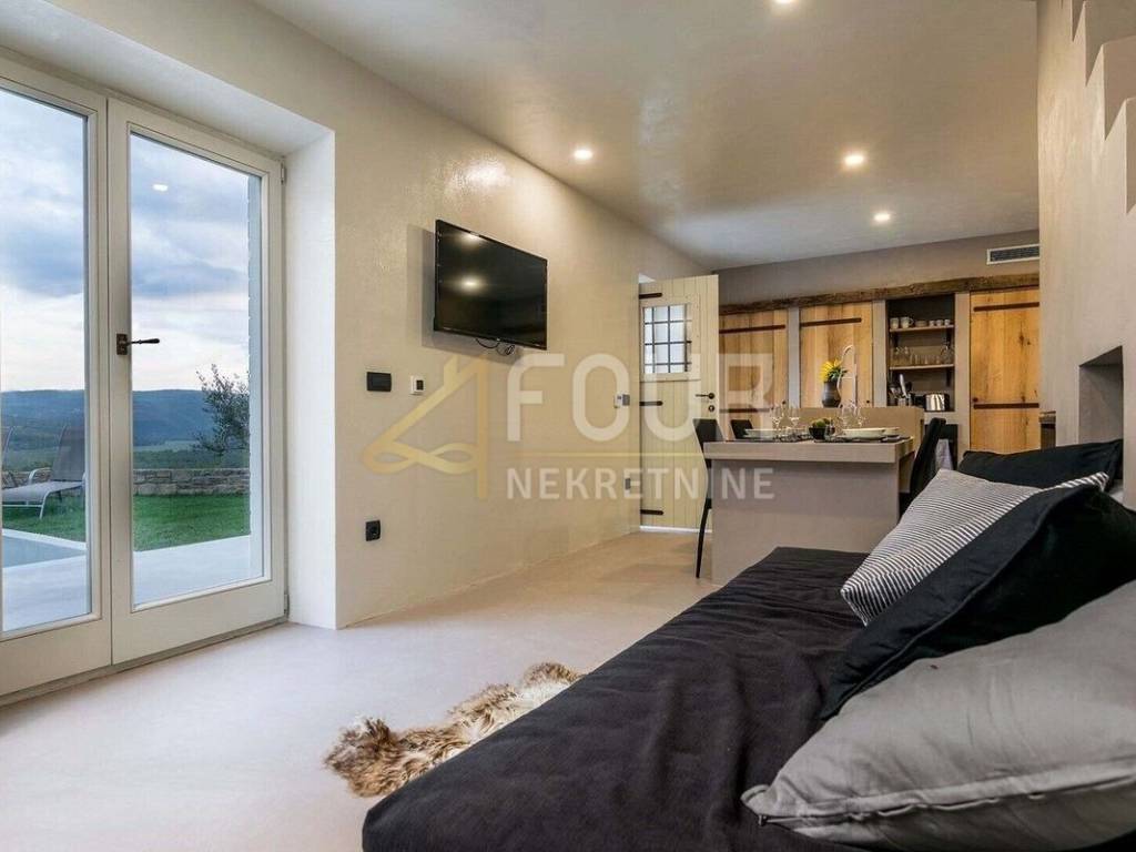 We offer a beautiful Istrian stone house with a swimming pool and a view of the famous town of Motovun. The house has been completely renovated in an authentic Istrian style, with a combination of stone and wood, and is superbly decorated and equipped! On the ground floor there is an open space kitchen with a dining room and a living room and a spa area with a sauna, while on the first floor there are two bedrooms, two bathrooms and a toilet. On the large and well-maintained garden there is a 24m2 swimming pool with a sun deck, a barbecue with a dining area and 2 parking spaces. The entire house is equipped with underfloor heating and air conditioning. Great opportunity for an investment in a tourist rental!