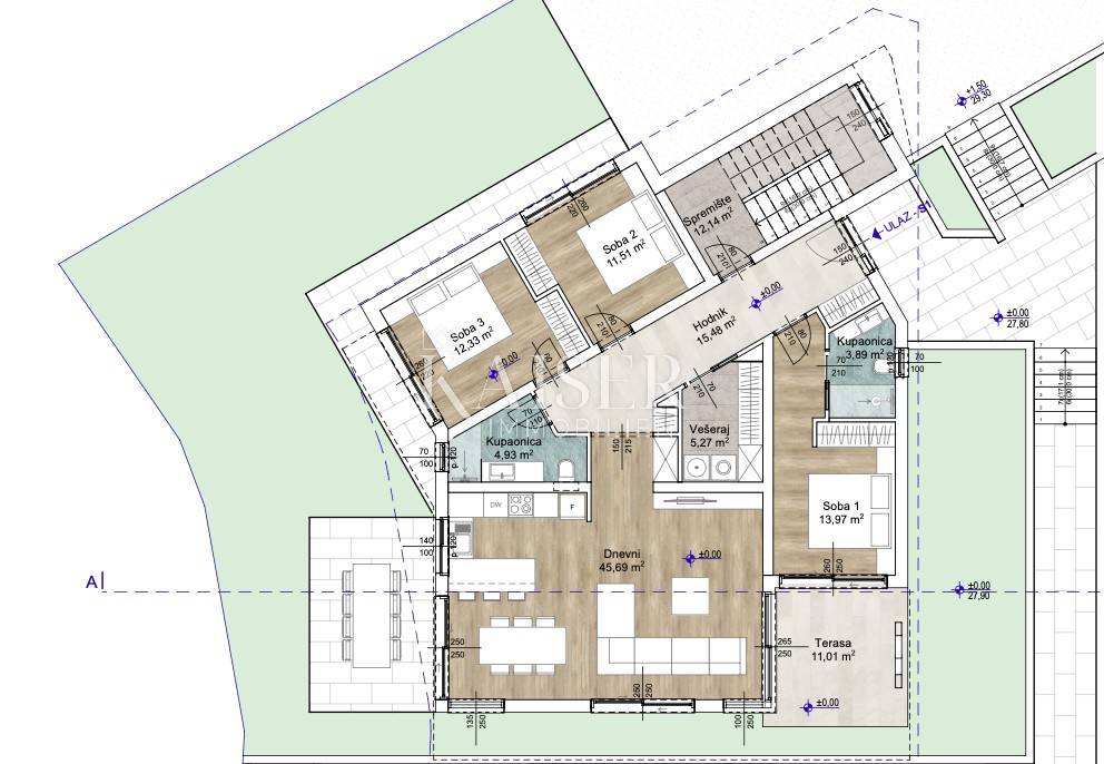 Kaiser immobilien offers a luxurious apartment in the town of Krk, 500 m from the sea. It is located on the ground floor of a villa with a total of three residential units and has a beautiful view of the sea. The living area is 137m2, and the apartment consists of an entrance area, a spacious living room, kitchen and dining room, three bedrooms and two bathrooms. The apartment also has a storage room and a laundry room, as well as a spacious terrace with a view of the sea, which is accessed through the living room. The future owner can choose the construction materials. The apartment will have underfloor heating, high-quality aluminum joinery, and all rooms will be air-conditioned. The apartment also includes two parking spaces and a 120m2 garden. Completion of the works is expected by the end of 2023.