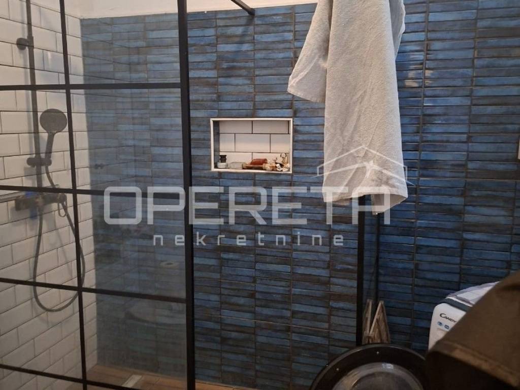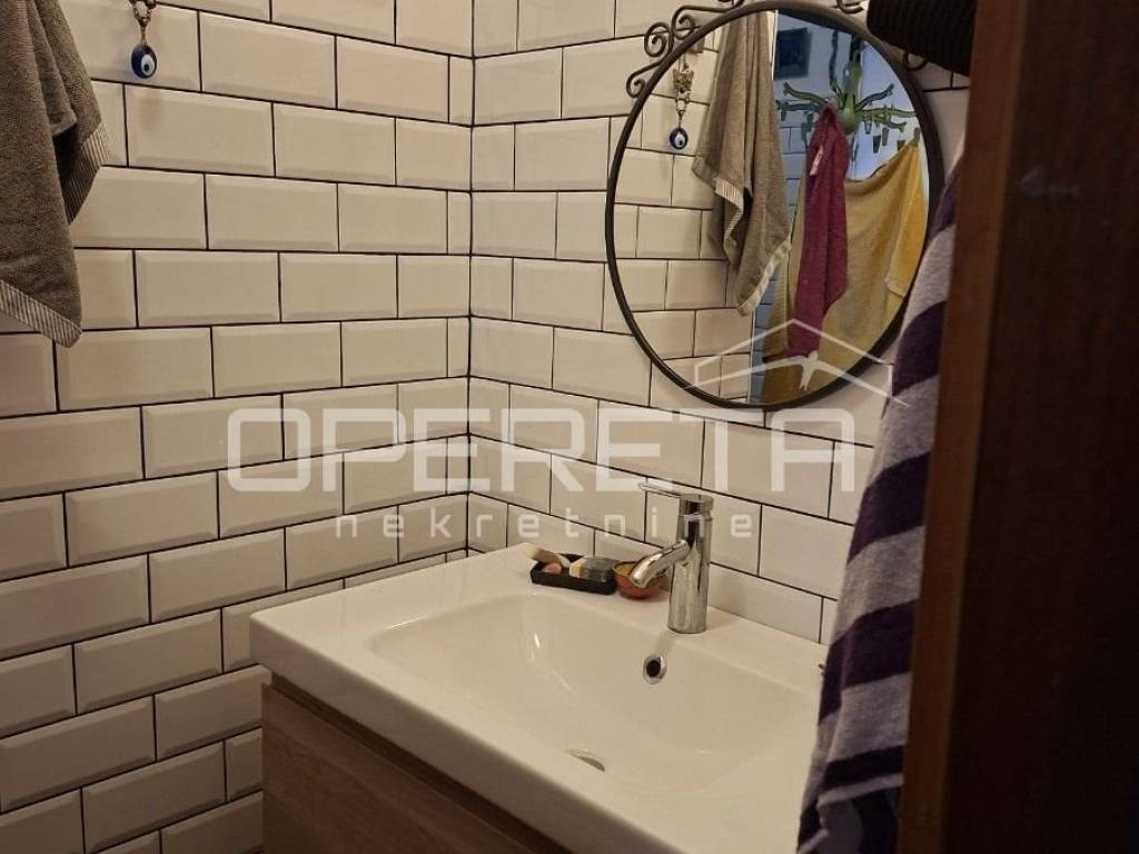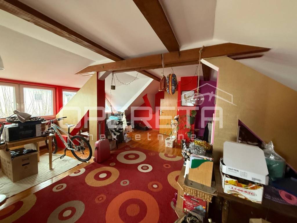 Gornja etaža (visoko potkrovlje) površine 60m2 ima potencijal da se odvoji na 2 sobe. Na katu se nalazi i sanitarni čvor.