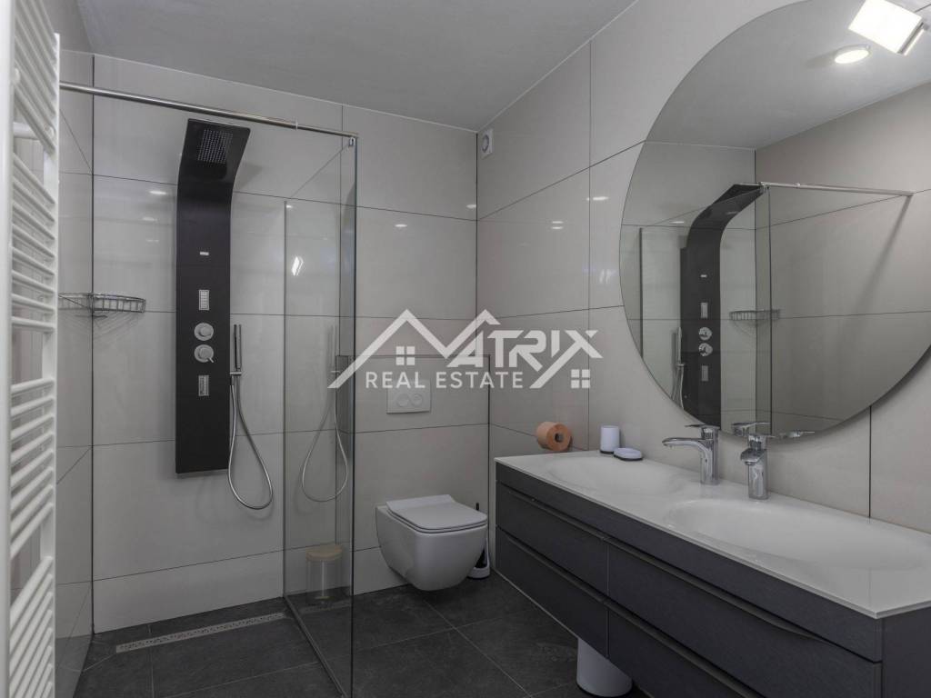 The central part of the spacious garden is a heated pool of 34 m2. The pool is heated using a heat pump, and the pool is equipped with hydromassage jets, a waterfall, modern LED lighting, a counter-floating pump and an automatic cleaning robot. This further emphasizes the luxury and quality of construction and equipment of the swimming pool. A landscaped grass area with automatic irrigation and a paved area with parking for at least 4 vehicles complete the beautiful garden.