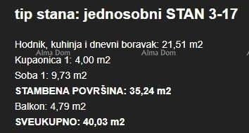 In the city of Umag, within a modern residential project comprising a total of 122 apartments, an apartment on the 3rd floor of the residential building is for sale. The apartment has a total area of 40.03 m² and is designated as 3-17. It consists of a hallway, kitchen and living room, bathroom, bedroom, and a balcony of 4.79 m².The apartment comes with a storage room of 3.75 m² and a covered parking space.The building is constructed with reinforced concrete, featuring a thermal insulation facade (ETICS 10 cm). It is equipped with high-quality PVC joinery with lift-and-slide doors, electric blinds in the rooms, multi-split air conditioning in all areas, top-class ceramics, and parquet flooring. The apartment has its own electricity and water meters, a video intercom, and connections for internet and TV.The building offers 74 garage spaces, 82 outdoor parking spaces, and 25 covered parking spaces, totaling 105 storage units, an elevator, and staircases from four main entrances. The basement houses garages and communication areas, while the apartments are located from the 1st to the 3rd floor.The location is extremely attractive – within a radius of 100 to 500 meters, there are a kindergarten, school, shops, sports facilities, and the city center, while the sea, promenade, and city beach are approximately 700 meters away.For additional information and viewings, please contact:Azra+385 91 611 5706+385 98 420 885azra@almadominvest.com