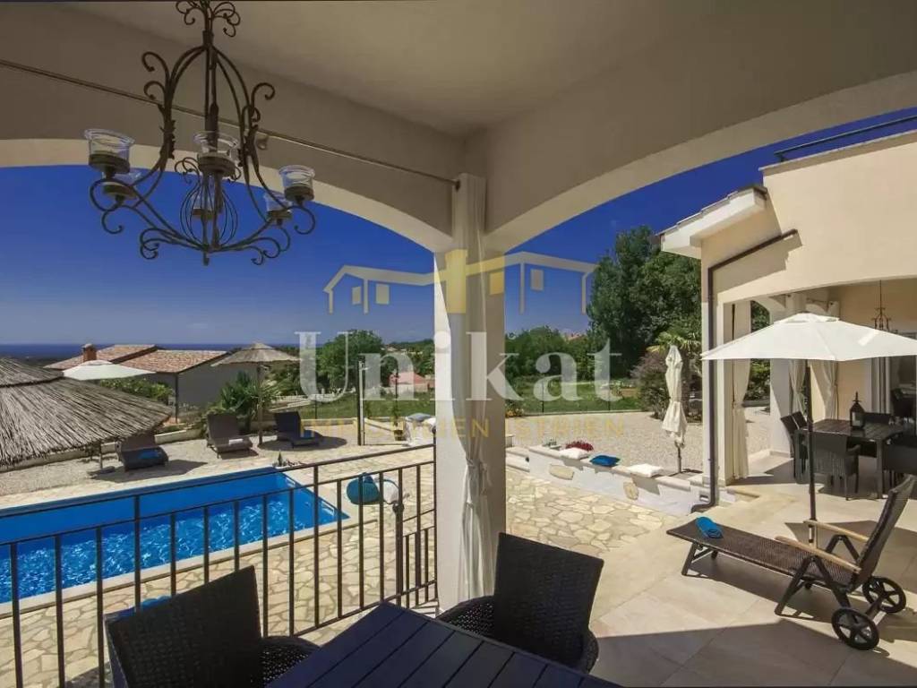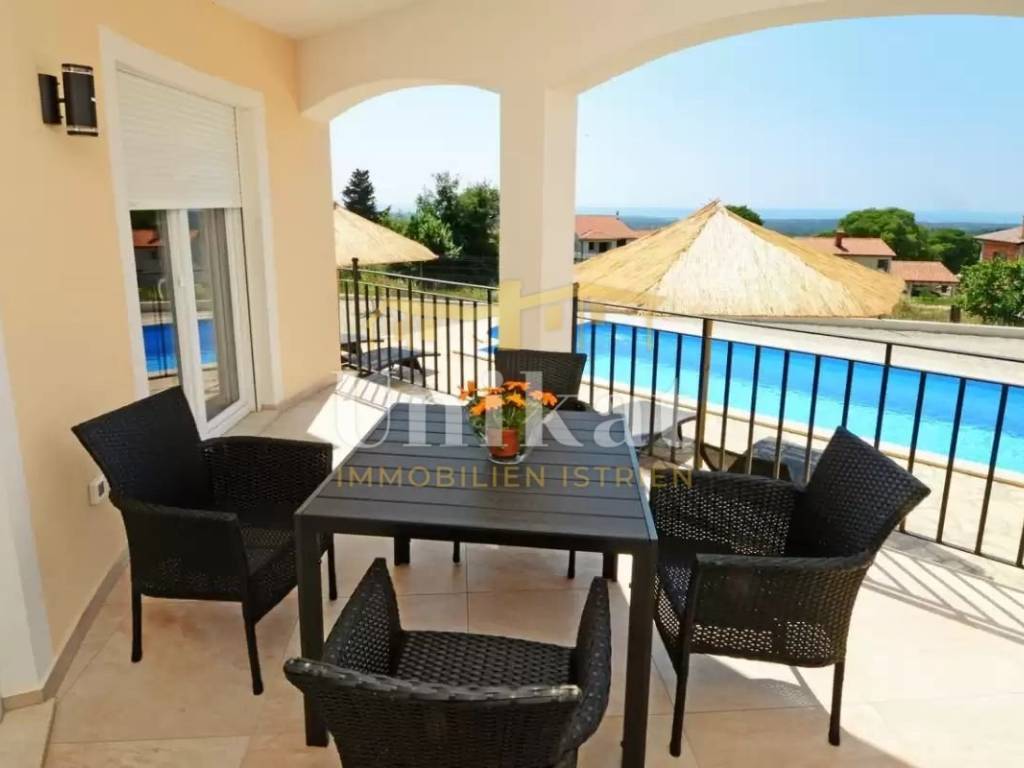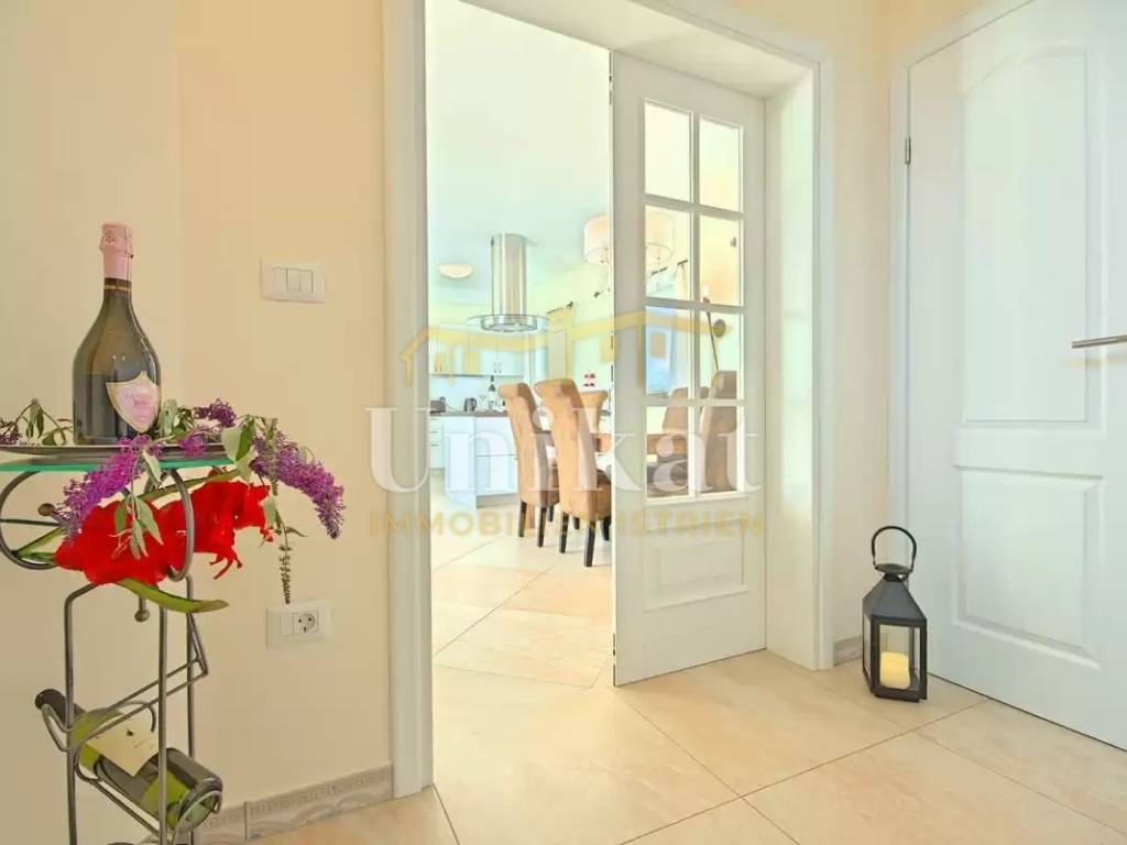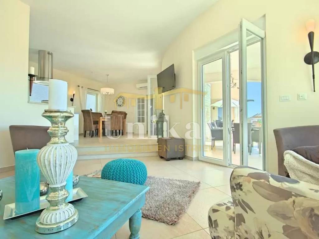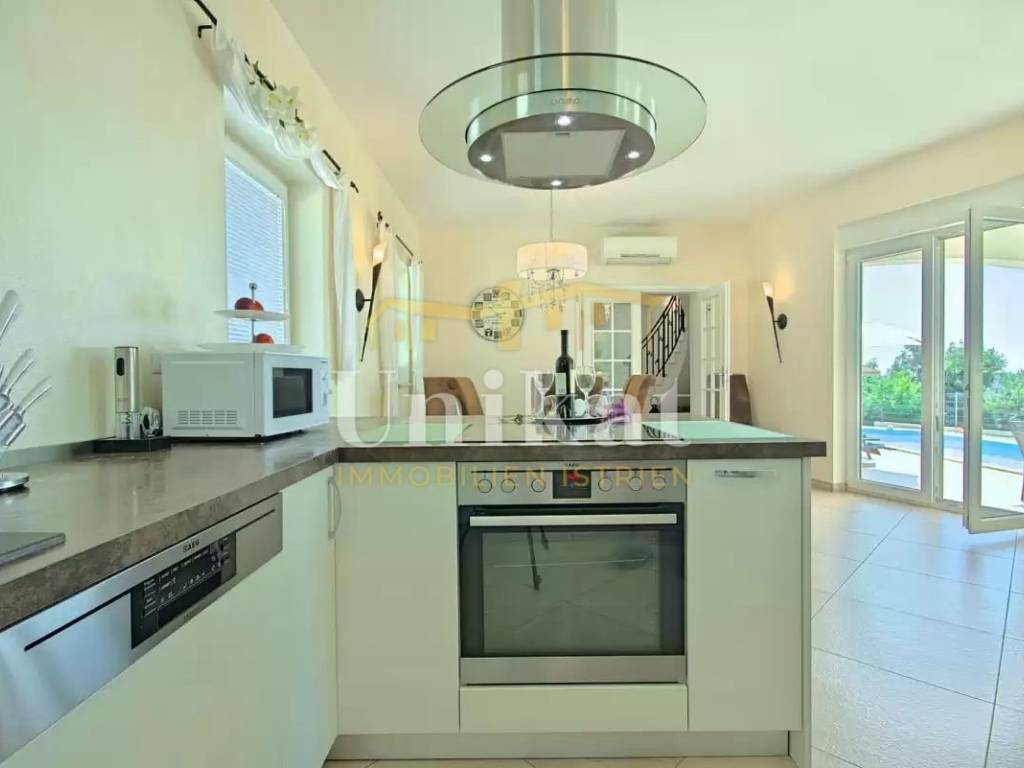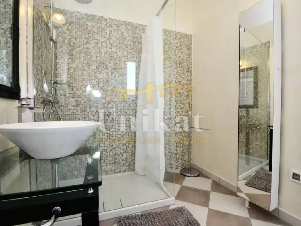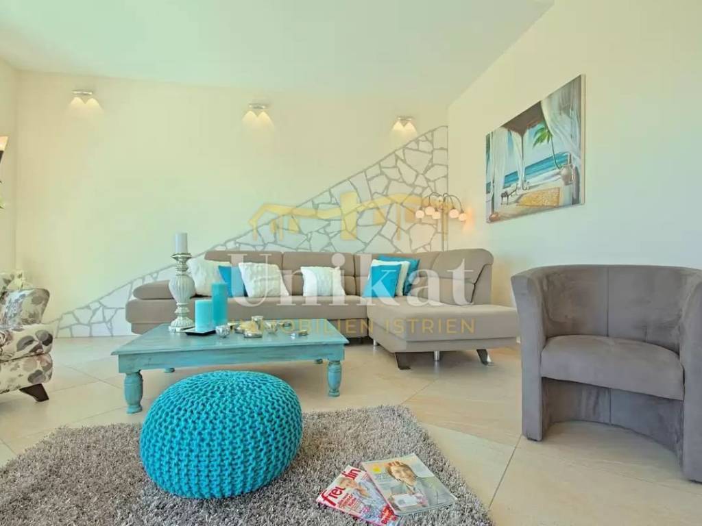 This beautiful villa is located in a place near Poreč, 7 km from the sea and 12 km from the town of Poreč. The location has good infrastructure with markets, restaurants, and all other amenities for everyday life. Since the house is situated on an elevation, it offers a beautiful open panoramic view of the sea, extending to Vrsar, Poreč, and Novigrad, and on clear days the view reaches all the way to Venice.