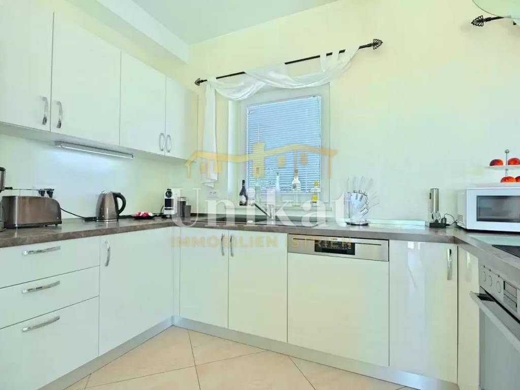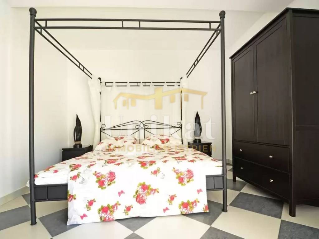 On the ground floor, there is a spacious hallway with a guest WC and a small storage room. From the hallway to the right, you enter an open living room with a kitchen and dining area, and from the hallway to the left, there are two bedrooms and a bathroom. This left part also has an additional, separate entrance. Both bedrooms have direct access to the first covered terrace, which further leads out to the pool and sunbathing area, while the living room and dining area have an exit to the second covered terrace, which also leads to the garden, pool, and sunbathing area. Additionally, on the ground floor, there is a storage room accessible from the outside, where the washing machine, dryer, and water heater are located.