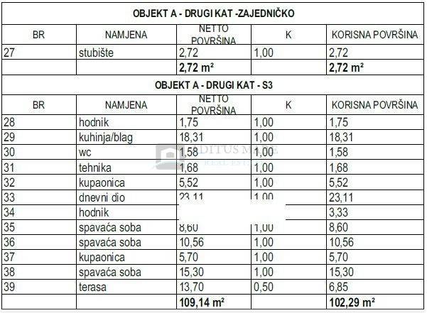 Stan je ukupne korisne neto površine 102,29m i pripada mu jedno parking mjesto.
