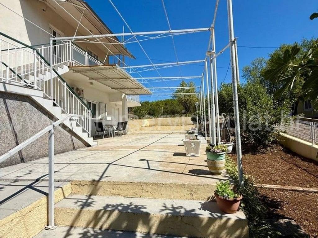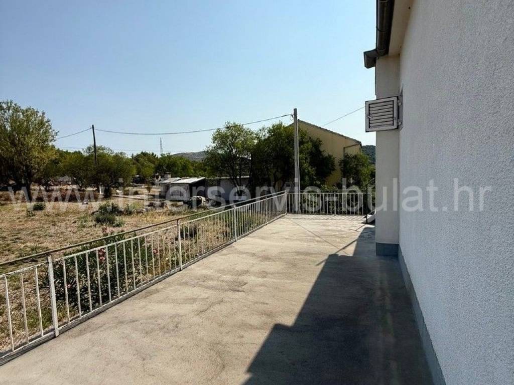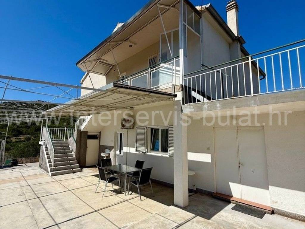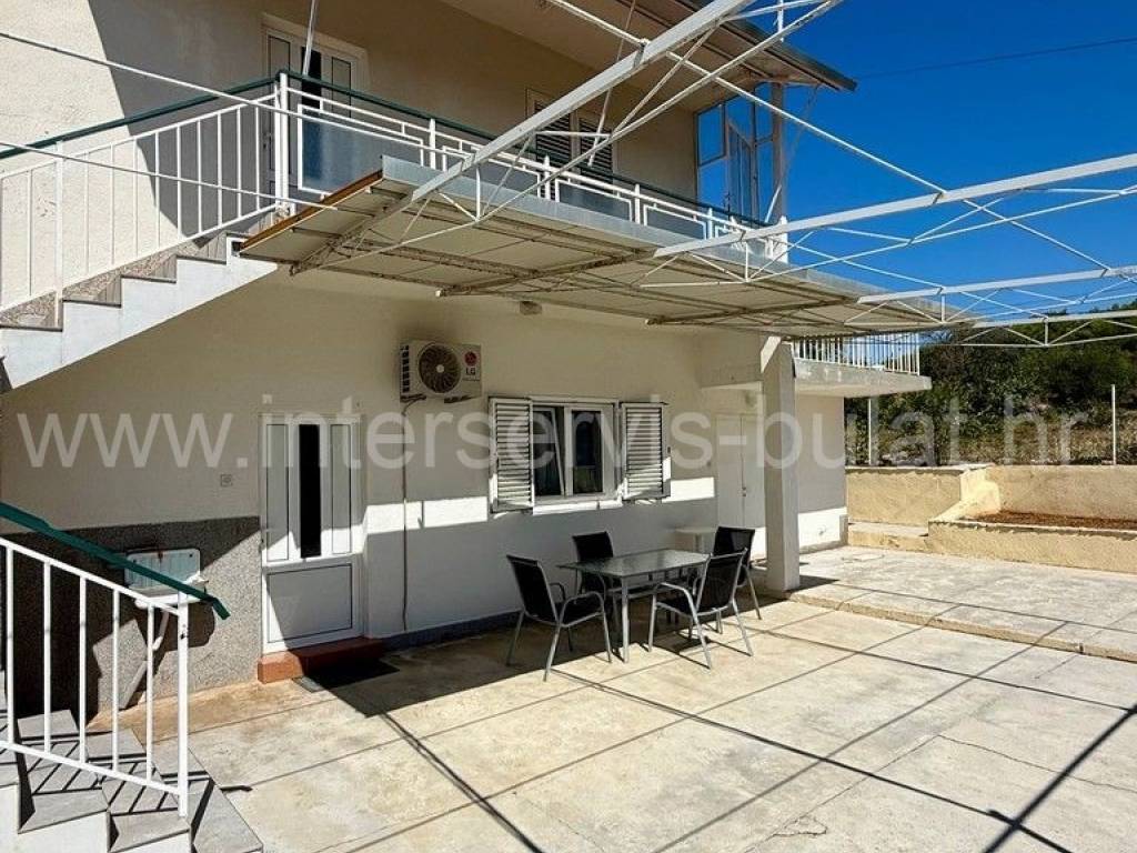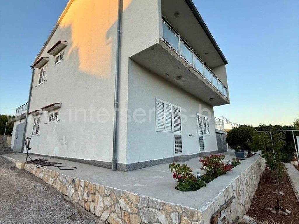 .::: Bilice, house with two apartments on a large plot :::. The detached family house with two apartments is located in Bilice close to Šibenik, offers 162sqm of living area and is situated on a spacious plot of 879sqm. The ground floor of the house contains a 17sqm garage, a habitable 2-bedroom apartment, a central heating room and two storage rooms. In front of the apartment is a comfortable 40sqm terrace. An external staircase leads to the upper floor where there is a further two-bedroom apartment with a balcony and a terrace. In the yard there is an outbuilding of 26sqm that offers additional storage space and a barbecue. The yard also offers plenty of space for parking, landscaping or building a swimming pool. Tour of the property is available by prior arrangement and appointment booking (two days in advance). Please specify ID number of the property when contacting us. Looking forward to your call.