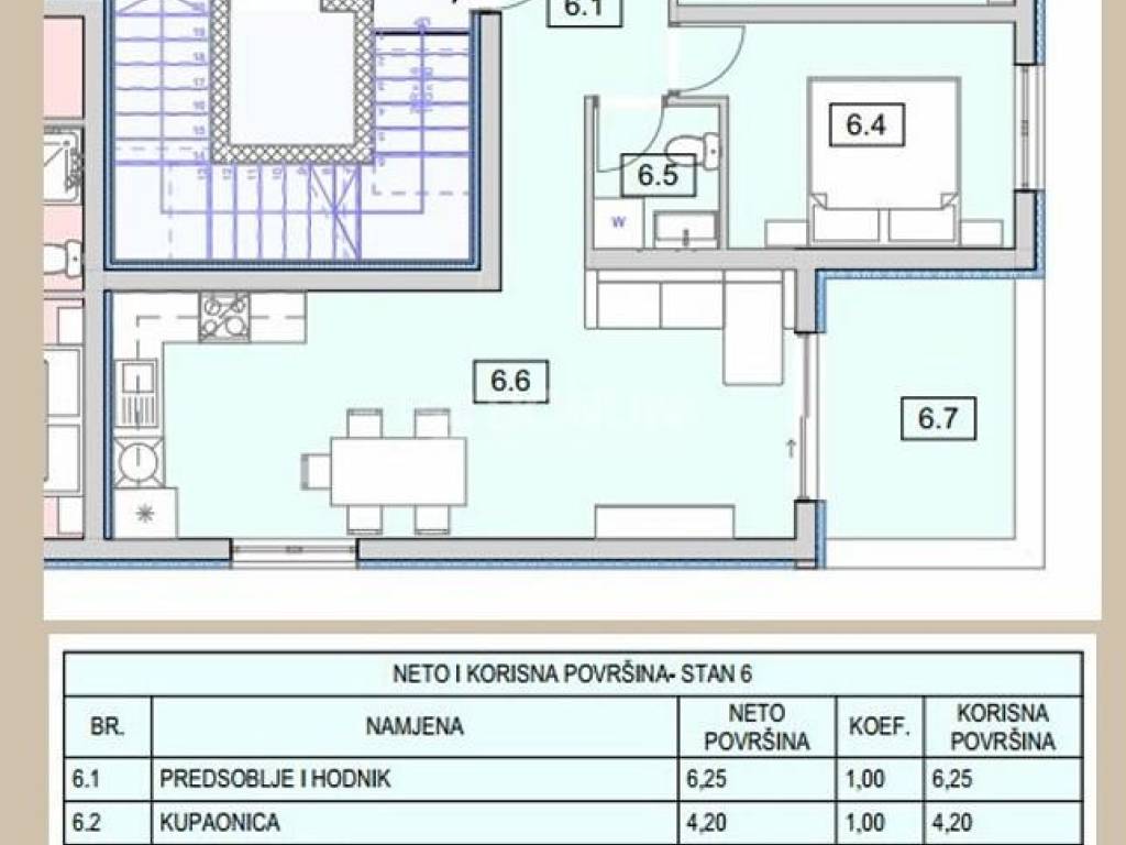 This modern first-floor apartment with a total usable area of 64.61 m² is an excellent choice for a smaller family or as an investment for tourist rental. It consists of two bedrooms, a bathroom, an additional guest WC, and a comfortable living room connected to the kitchen and dining area. The living space opens onto a covered terrace of 6.97 m², ideal for relaxing while enjoying the fresh sea air. The sea and beach are only 50 meters away, while the town center is 950 meters away. One parking space is included.