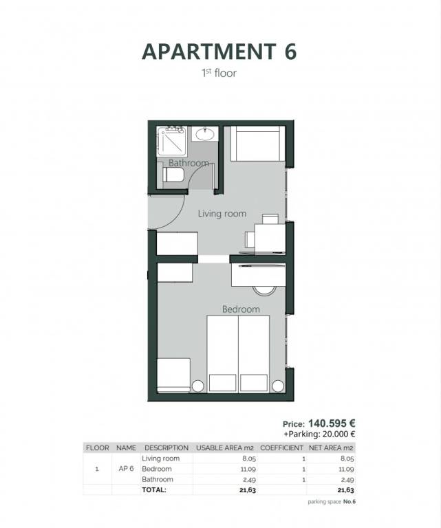Apartment AP6 consists of one bedroom, a living room that can be functionally adapted as an additional room, a bathroom and has a total net area of 21.63 m2. This apartment represents an extremely efficient micro-accommodation concept, designed for maximum space utilization and high demand in hotel and tourist rental.