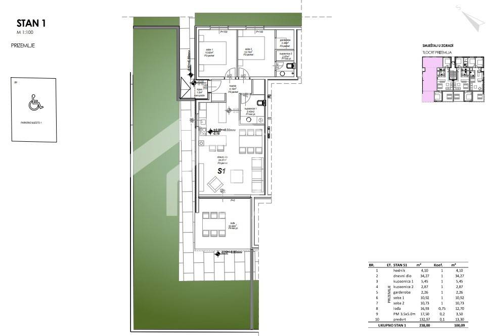 A spacious two-bedroom apartment (S1) on the ground floor of a new building is for sale in Privlaka, in the immediate vicinity of Zadar. The total area of the apartment with its annexes is 100.09 m2.