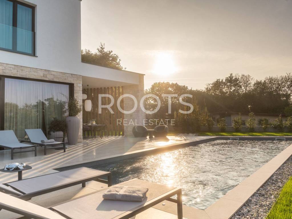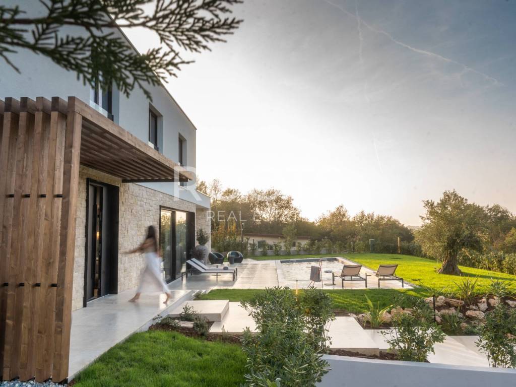 Istra, Marasi, izuzetna i moderna, kompletno dizajnerski namještena vila od 225 m2 sa bazenom s uređenom hortikulturom i 2 natkrivena parking mjesta.