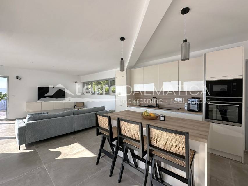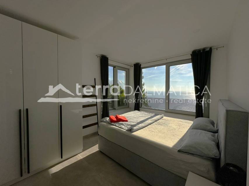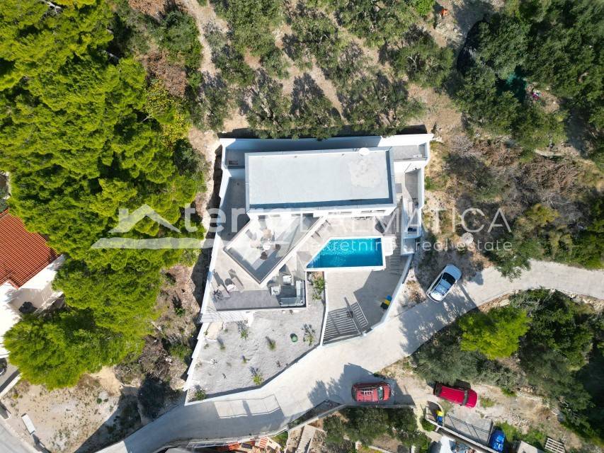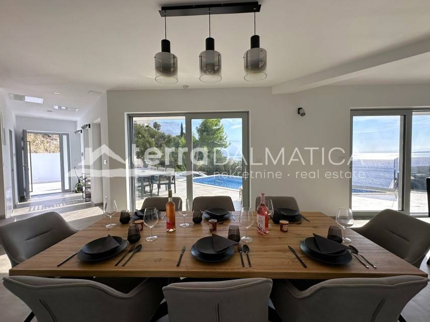 On the ground floor there is a spacious living room connected to the kitchen and dining room, from which there is a beautiful panoramic view of the Adriatic Sea and the island of Brač. There is also one bathroom on the same floor. The entire space is dominated by large glass walls that give the space plenty of light and open up the view of the sea from every point. In front of the villa there is a spacious terrace with a swimming pool, an outdoor dining room, a lounge area for relaxing and socializing, and a sunbathing area with deck chairs. Behind the villa there is an outdoor summer kitchen and a storage room. On the first floor there is a hallway that leads to three bedrooms. Two of the bedrooms have access to a terrace with a stunning view of the sea, an ideal place for morning coffee, evening socializing or watching the starry sky. The third bedroom has access to the back terrace from which you can also see the sea, on both sides. This villa also has a garage and a storage room.