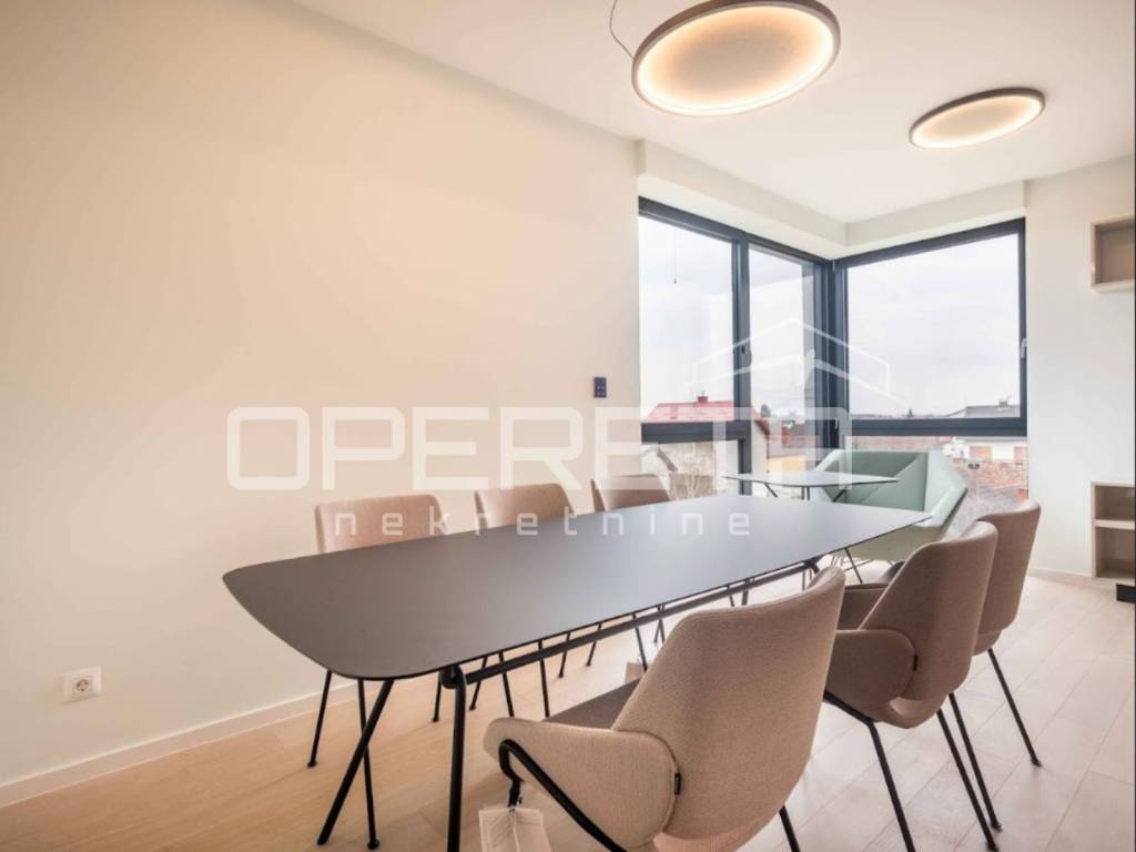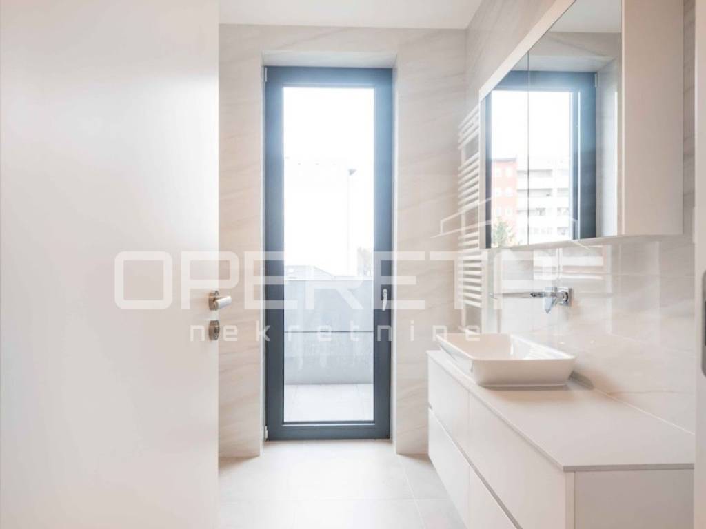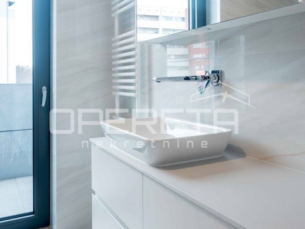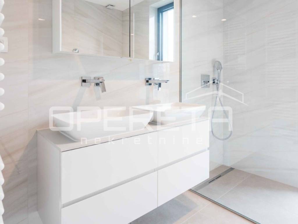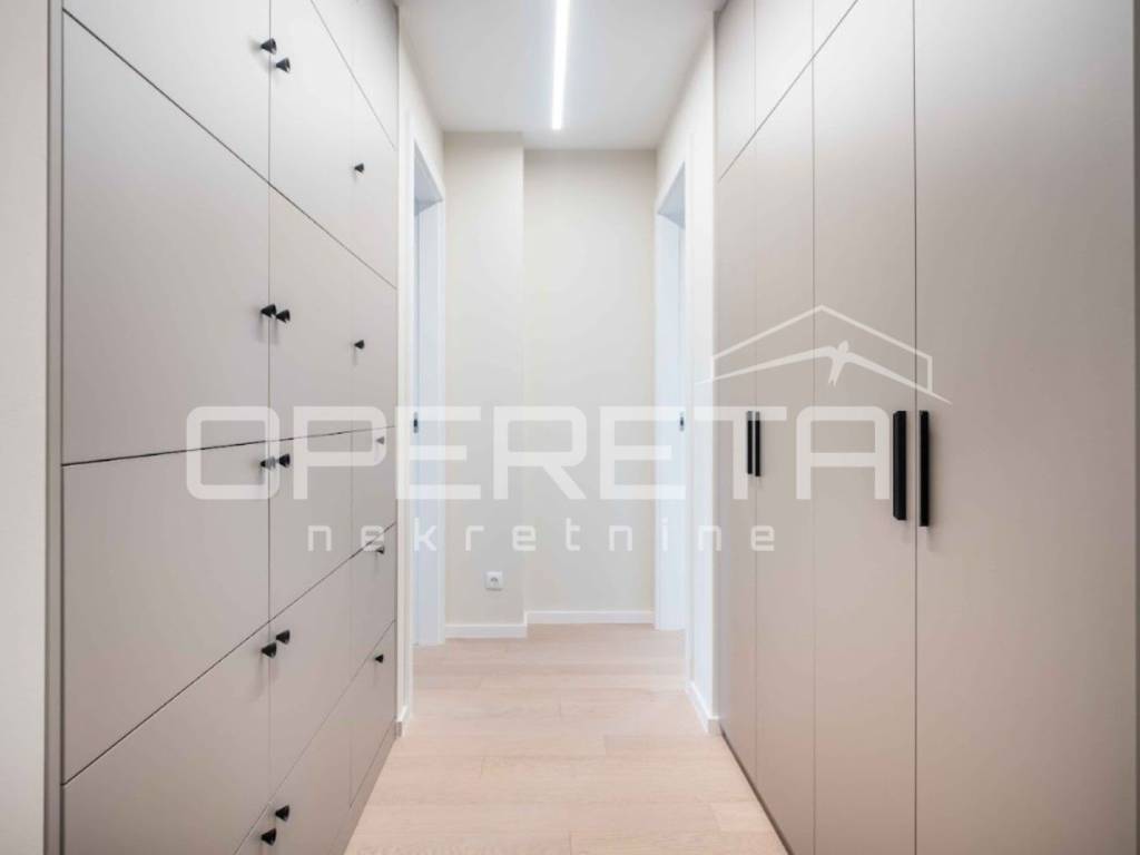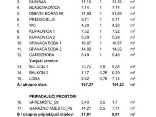 Luksuzni potpuno namješten novi stan s bazenom, na drugom katu u centru Varaždina, u ukupnoj veličini od 175, 92 m2. Površinski se sastoji od: ulaznog prostora od 11.52 m2, predsoblja od 5.66 m2, wc-a od 4.26 m2, spavaće sobe od 14.18 m2, kupaonice od 5.62 m2, kupaonice od 7,27 m2, natkrivenog balkona 1. od 0.78 m2, spavaće sobe i garderobe od 24.08 m2, natkrivenog balkona 2. od 9.93 m2, otvorenog prostora kuhinje, blagovaonice i dnevnog boravka od 50.89 m2, radne sobe od 16.45 m2, loggie od 6.65 m2. Stanu pripadaju dva unutarnje garažna parkirna mjesta, svako od 7,21 m2, te spremište od 3,37 m2.