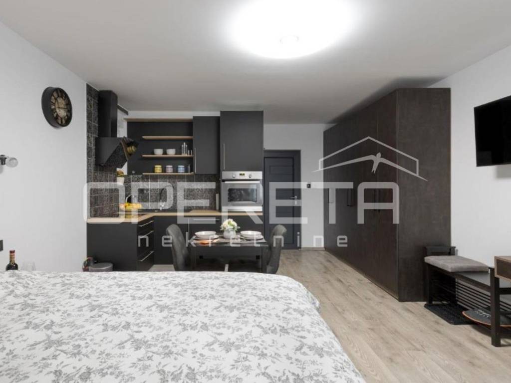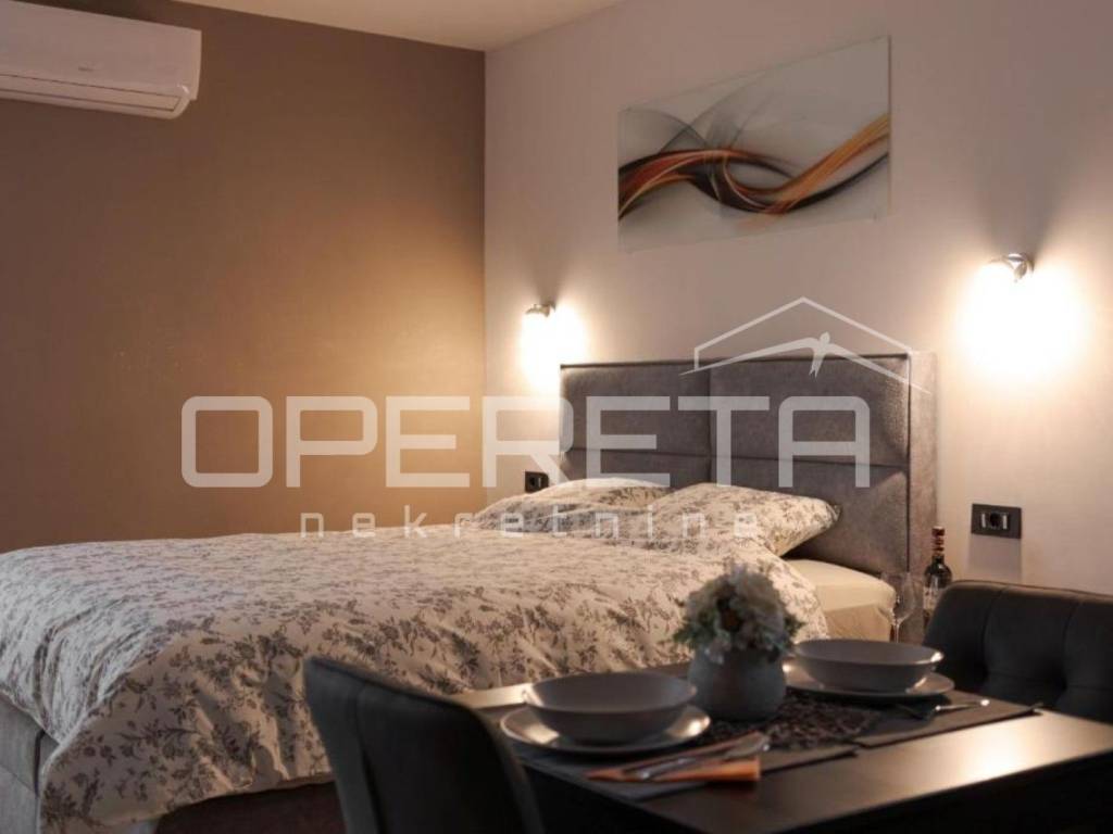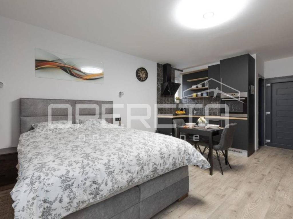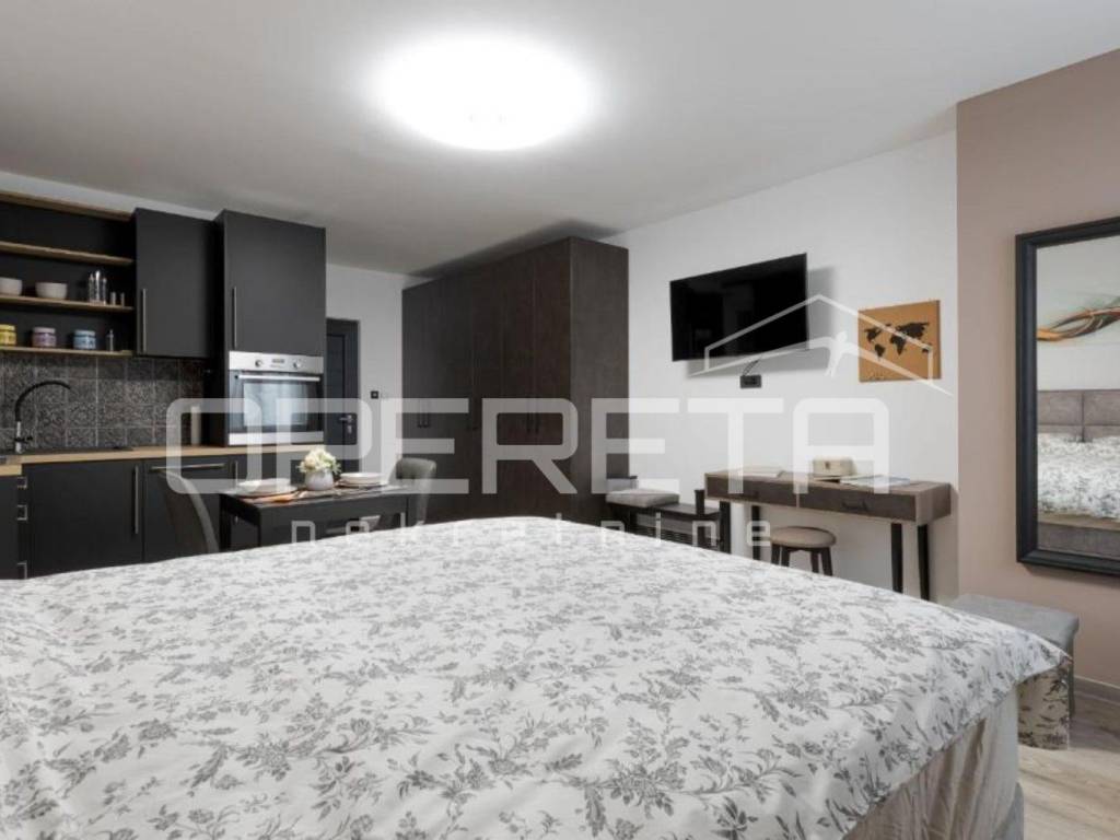 - garsonijera od 33 m odiše toplinom i modernim uređenjem, sastoji se od potpuno opremljene kuhinje s blagovaonicom, prostranog dijela za spavanje s bračnim krevetom te elegantne kupaonice.
