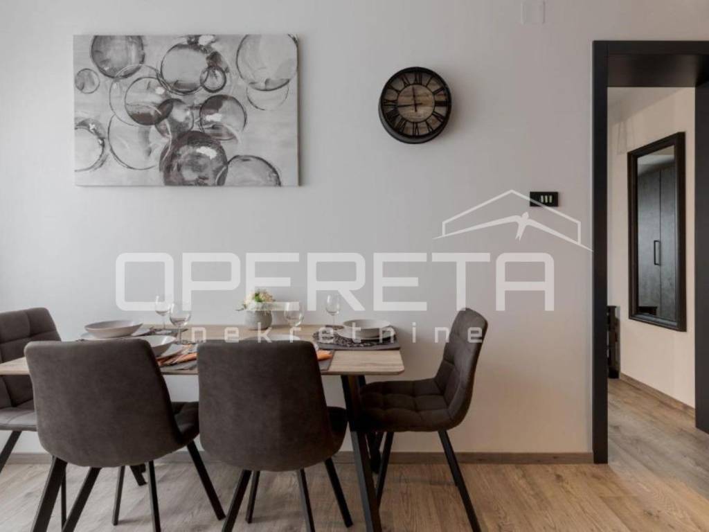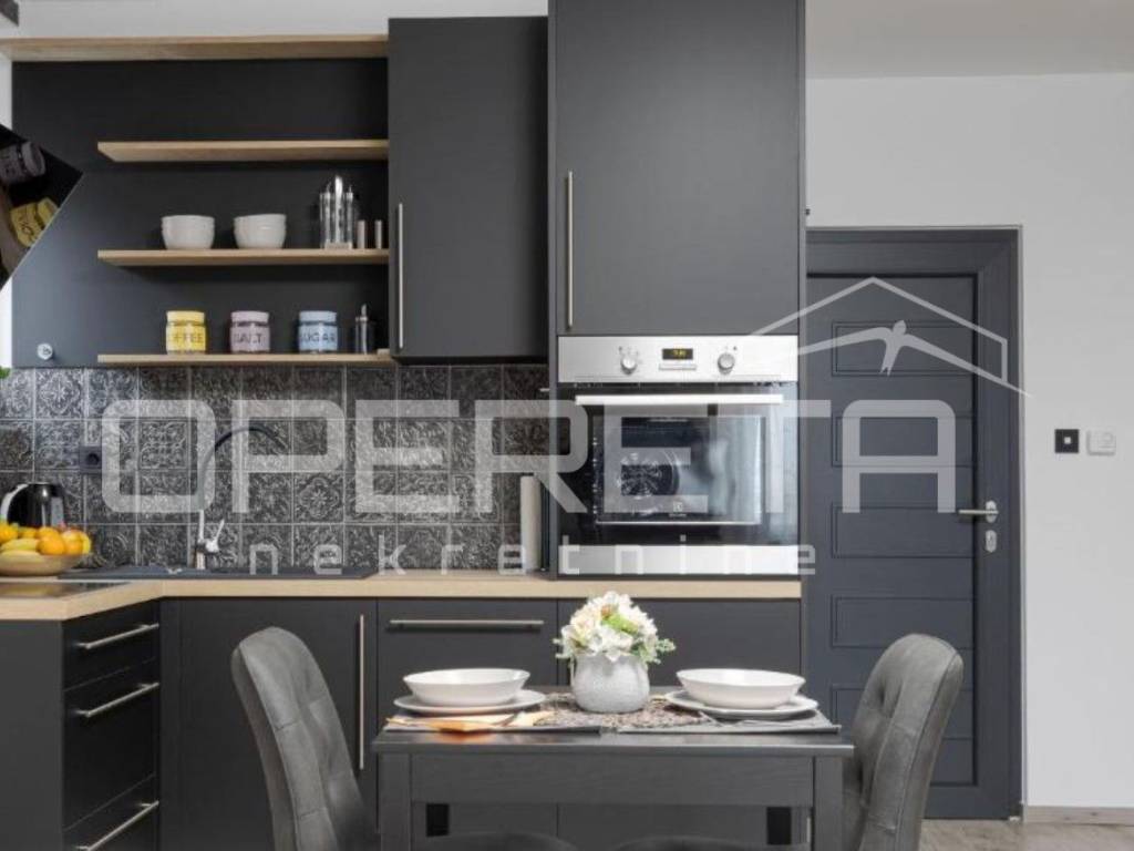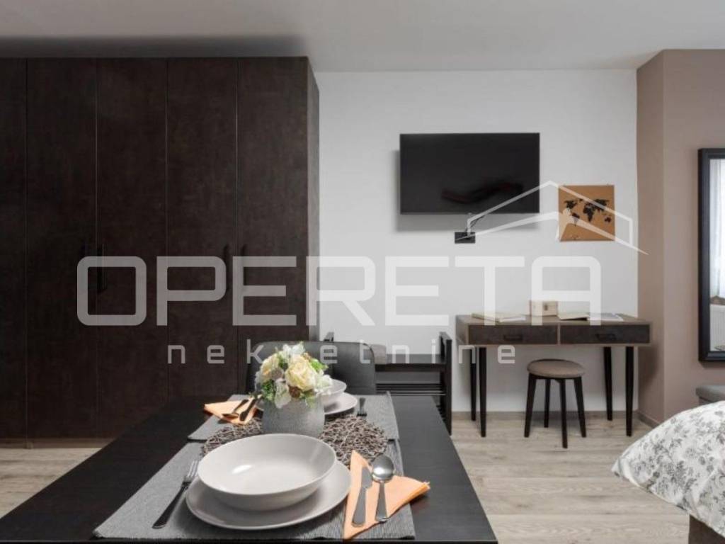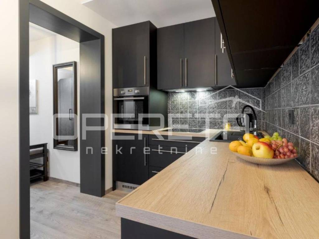 - garsonijera od 33 m odiše toplinom i modernim uređenjem, sastoji se od potpuno opremljene kuhinje s blagovaonicom, prostranog dijela za spavanje s bračnim krevetom te elegantne kupaonice.