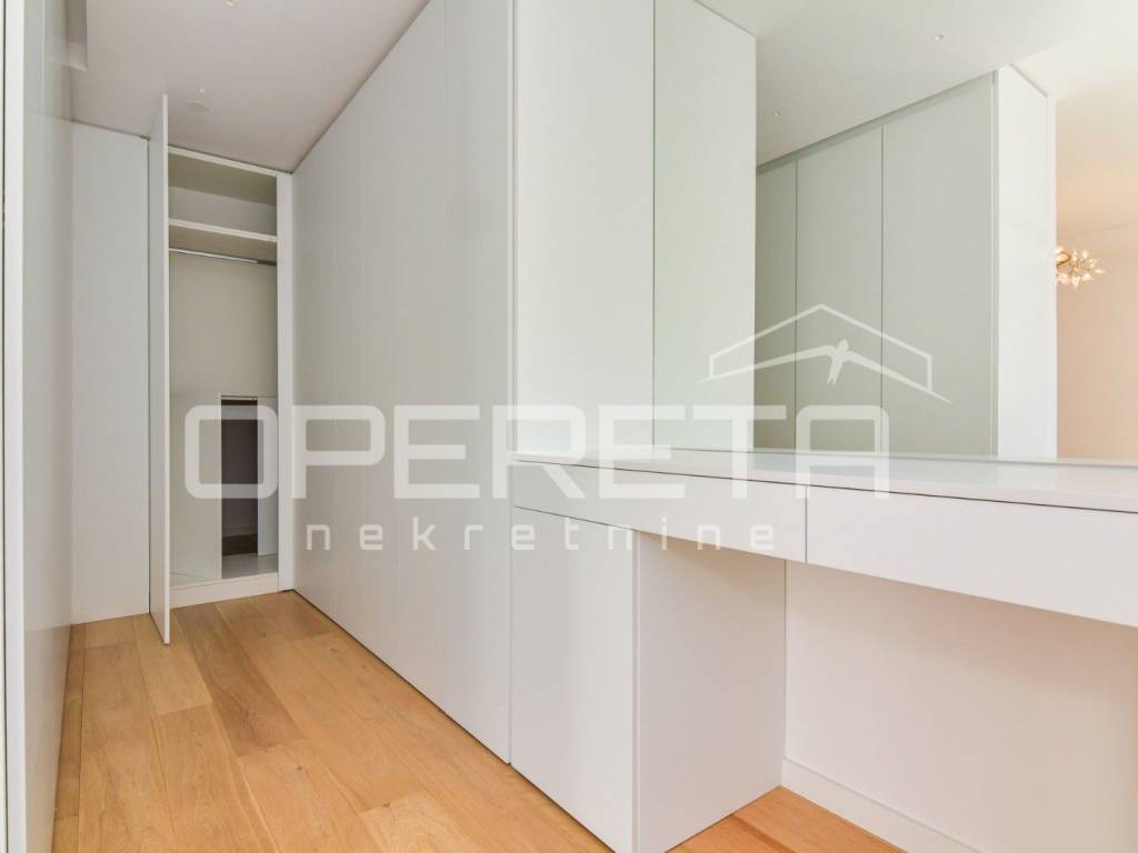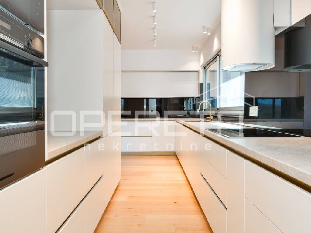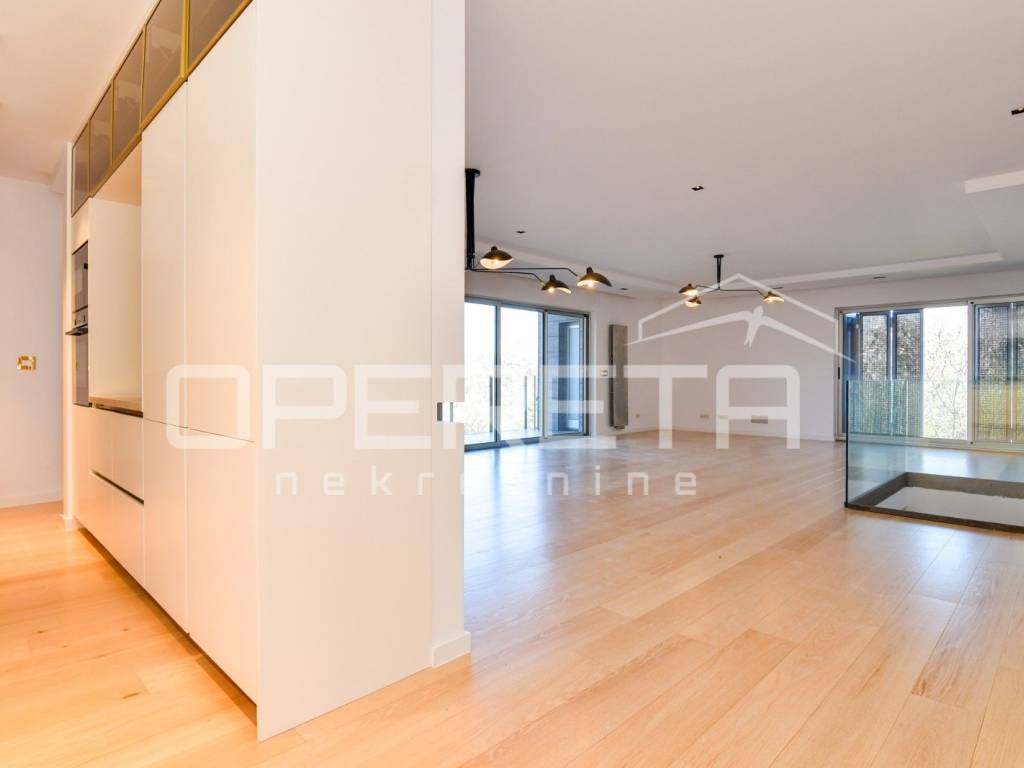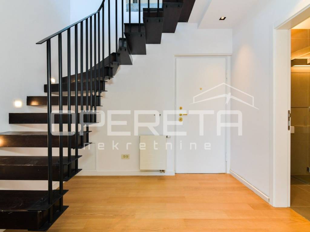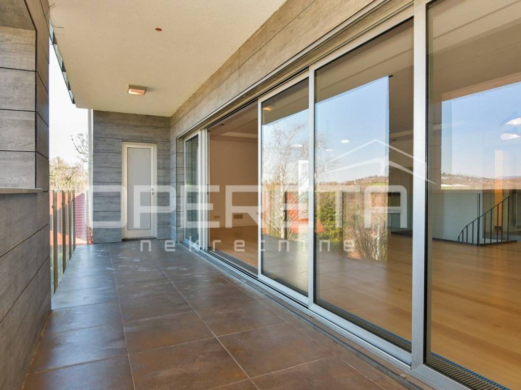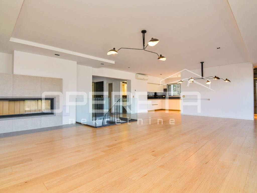 Luksuzan dvoetažan peterosoban stan na I katu i prizemlju. Zatvorene površine 217m2, loggia 15,14 m2 teretana 33,71 m2, terasom 72m2, vrtom cca 350m2, jedno parkirno mjesto 12m2, 3 garaže 18m2, ukupno NKP 400m2.