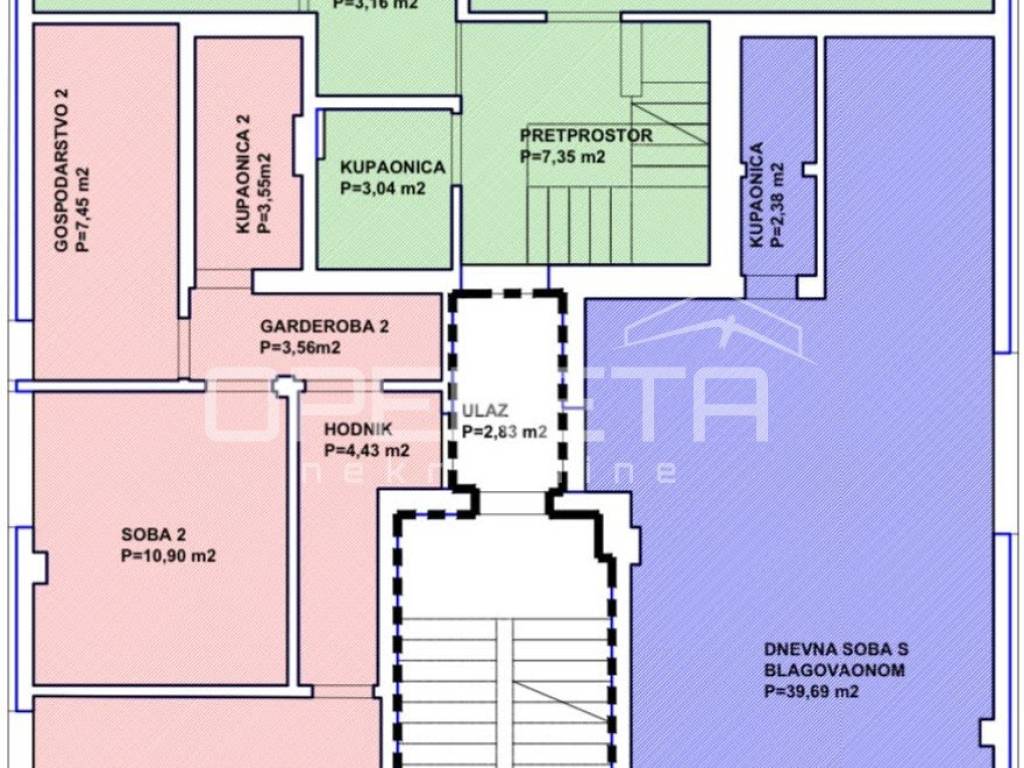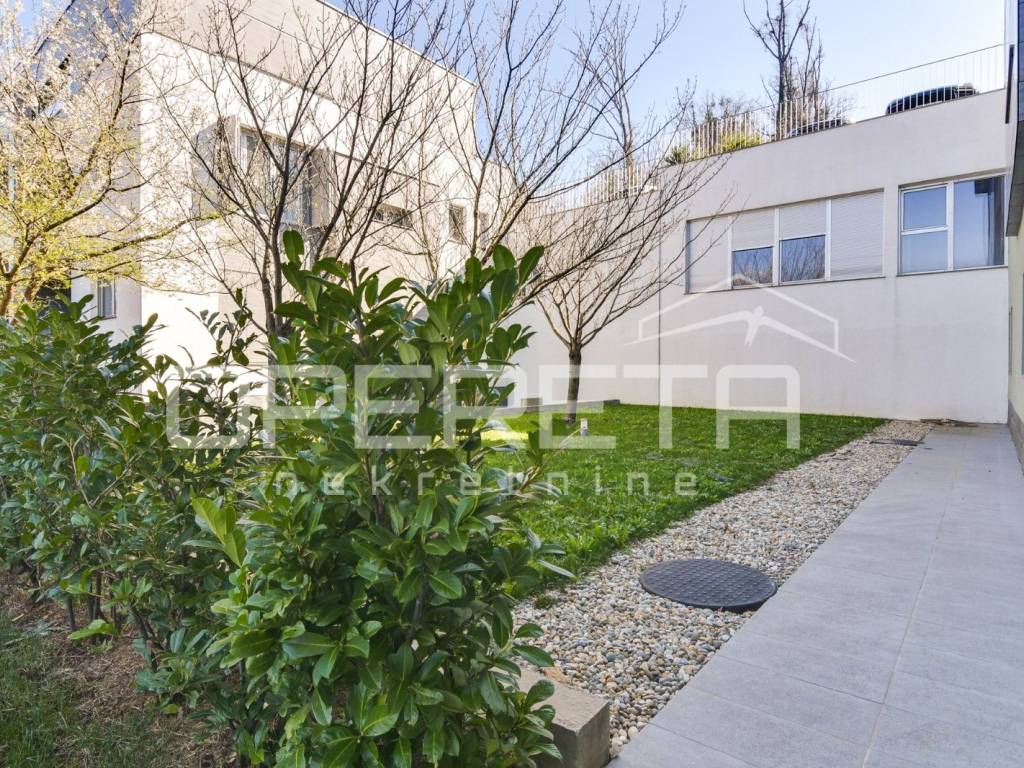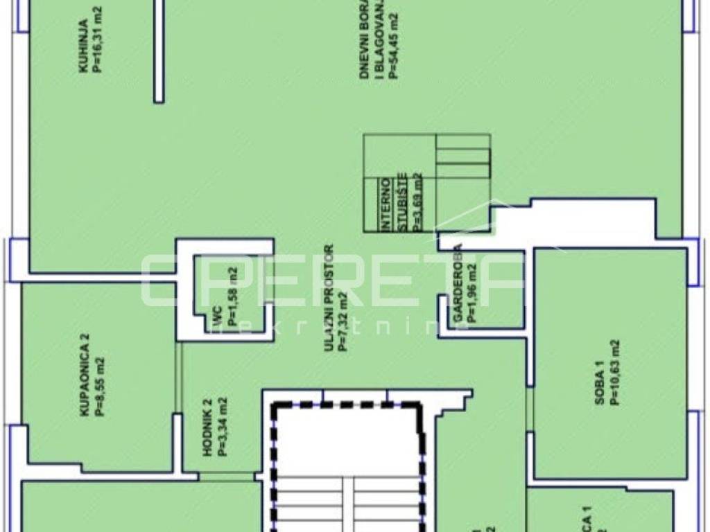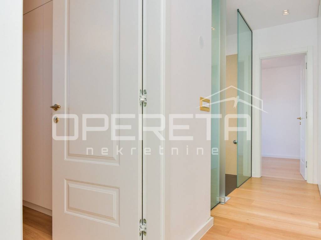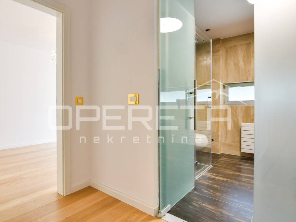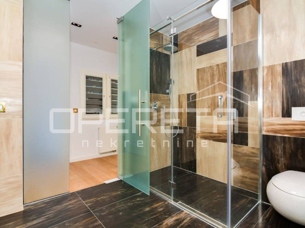 Luksuzan dvoetažan peterosoban stan na I katu i prizemlju. Zatvorene površine 217m2, loggia 15,14 m2 teretana 33,71 m2, terasom 72m2, vrtom cca 350m2, jedno parkirno mjesto 12m2, 3 garaže 18m2, ukupno NKP 400m2.