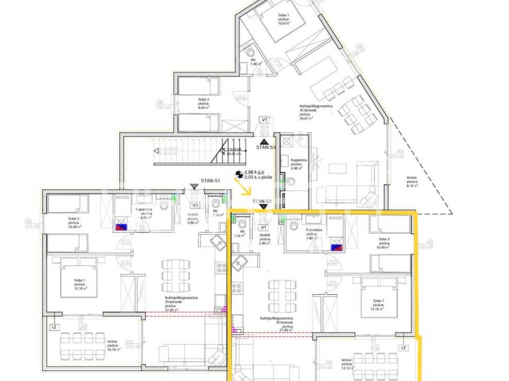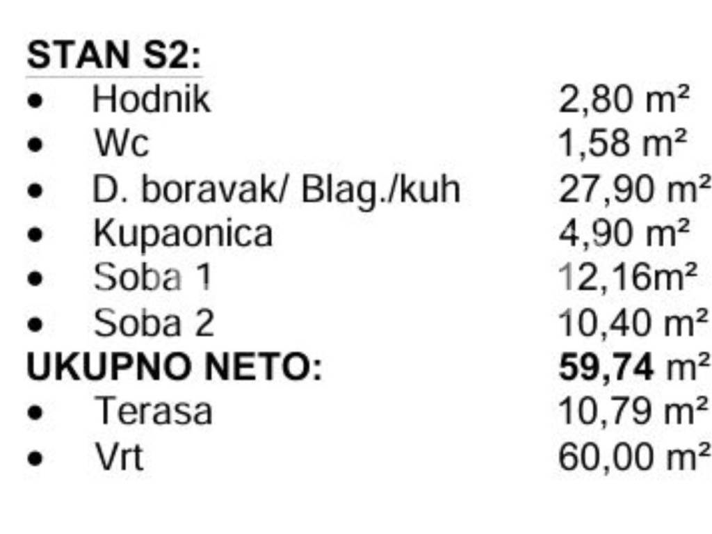 Apartment S2 is located on the ground floor and covers 59.74 m of carefully designed living space, consisting of an entrance hall, guest toilet, bathroom, spacious living room connected with the kitchen, two bedrooms, and a 10.79 m terrace (coefficient 0.50 = 5.39 m) and a garden 60m2 (coefficient 0,25 = 15m2) perfect for unwinding.
