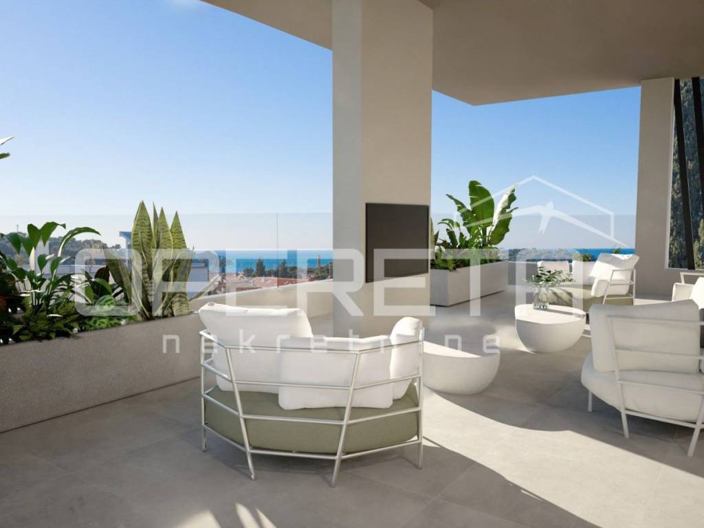 A spacious living room with kitchen and dining room and access to a large 32 m terrace with a beautiful view of the city and the sea, two master bedrooms, each with its own bathroom and dressing room, an additional bedroom also with its own bathroom. One master bedroom also has its own balcony.