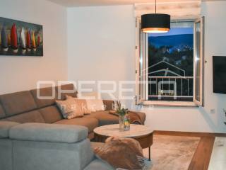 The spacious living room is connected to a modern, fully equipped kitchen and a glazed loggia, converted into an additional dining area. Thanks to the sliding glass walls, the loggia can be enjoyed regardless of weather conditions. From both the living room and the loggia, there are beautiful views of the sea and lush greenery.