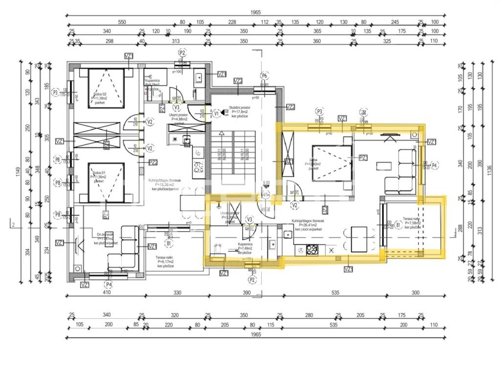 On a plot of 624 m, a modern residential building with a total of five apartments and 11 parking spaces is under construction. The building consists of a basement, ground floor and two floors, and each apartment has an associated storage room in the basement, enclosed by walls and doors, with a window that allows natural light and additional functionality.
