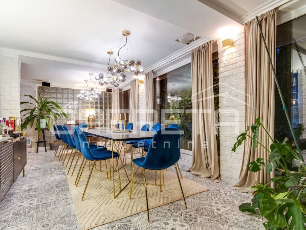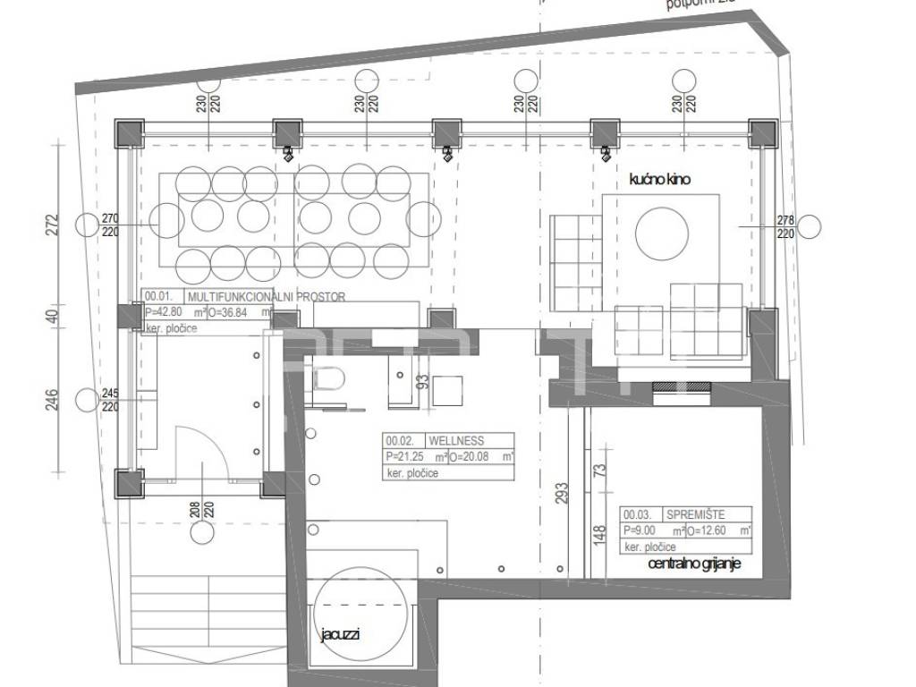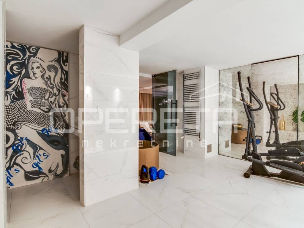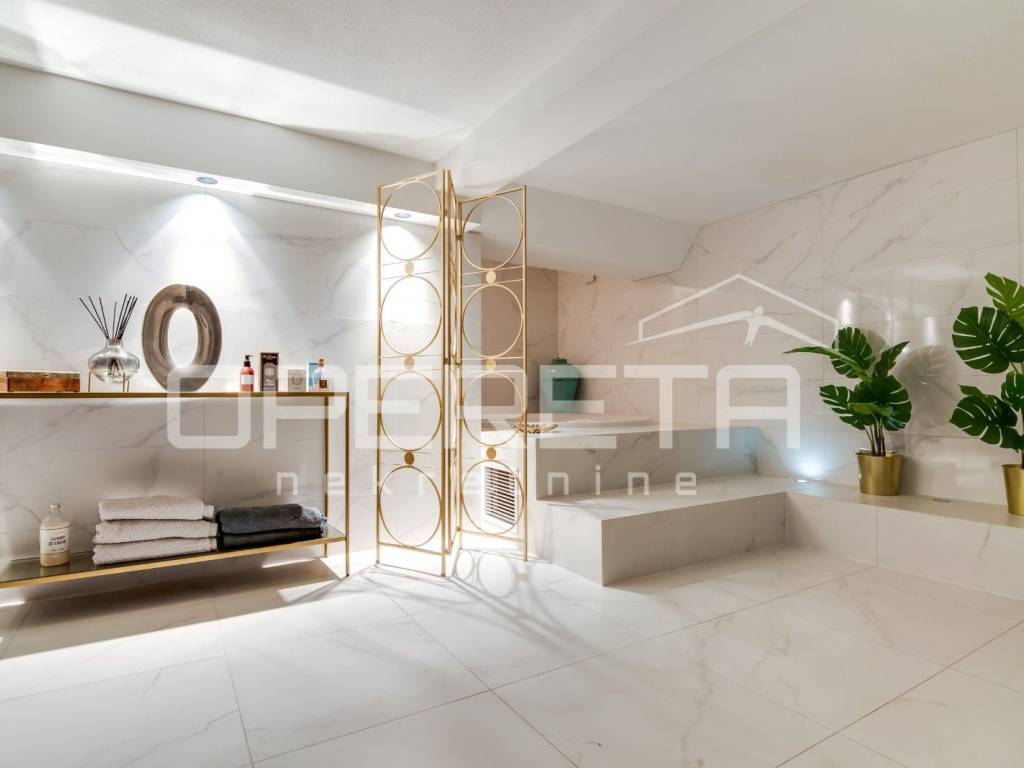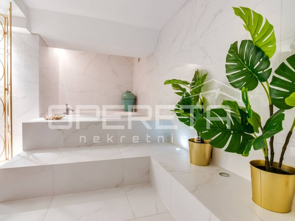 Na prvoj etaži (89m2) je smješten moderno uređen, otvoreni, ostakljeni prostor, okružen zelenilom gdje se nalazi veliki blagovaonski stol za 14 osoba, kućno kino, velika kupaonica s jacuzzijem s dovoljno prostora za rekreaciju te skladišna prostorija.