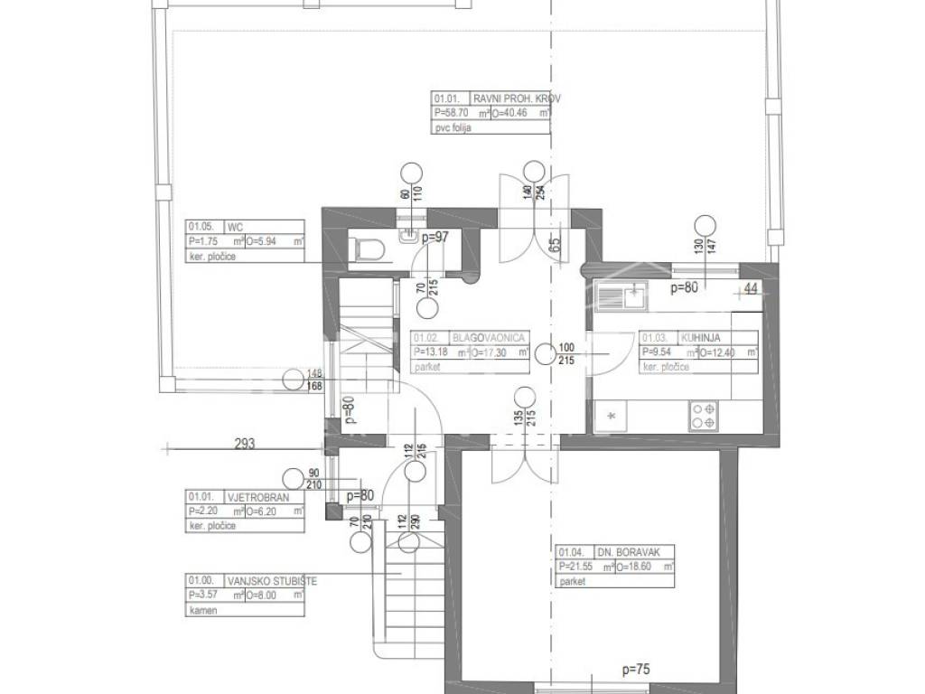 Visoko prizemlje (84,36m2) se sastoji od ulaznog dijela koji je povezan s blagovaonicom, odvojene kuhinje, dnevnog boravka, toaleta, velike terase (60m2) s pogledom na grad te stepeništa koje vodi na prvi kat (59,94m2) gdje su smještene dvije spavaće sobe, kupaonica i mala terasa.
