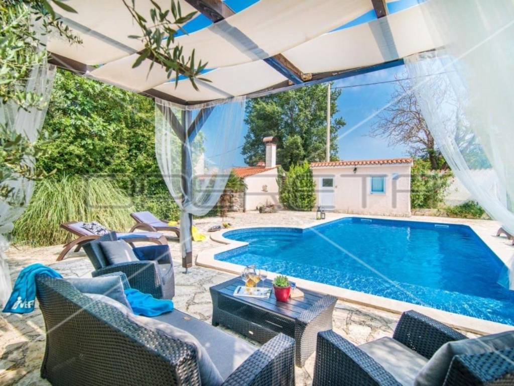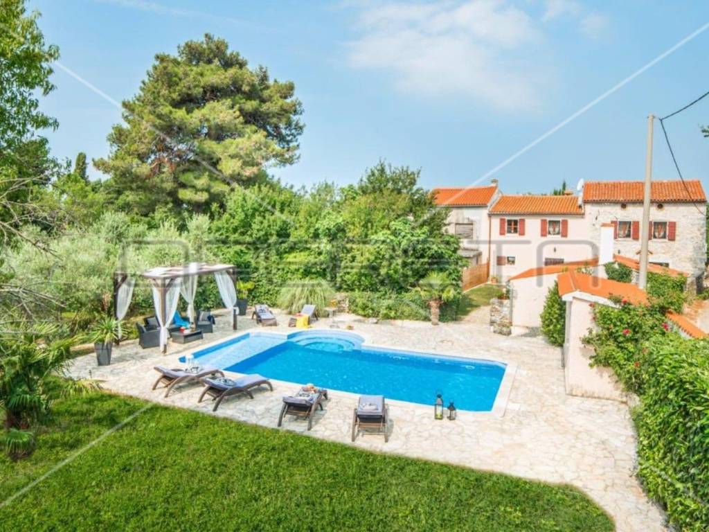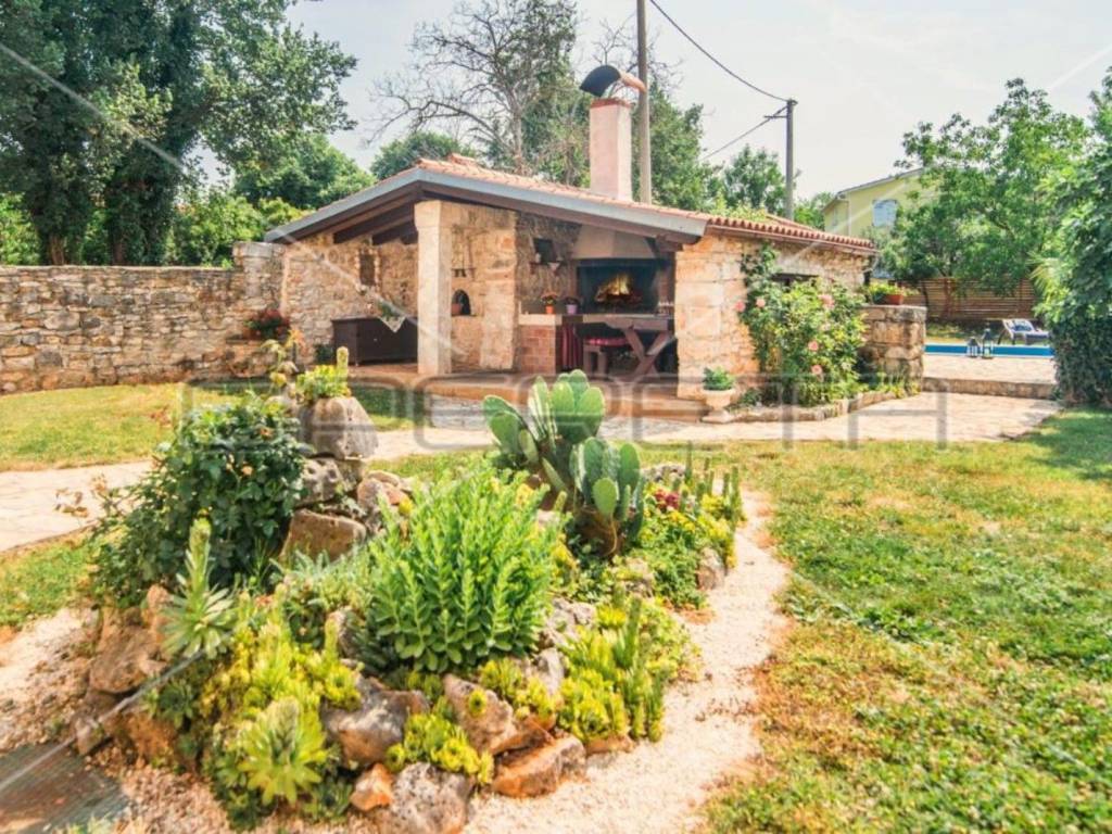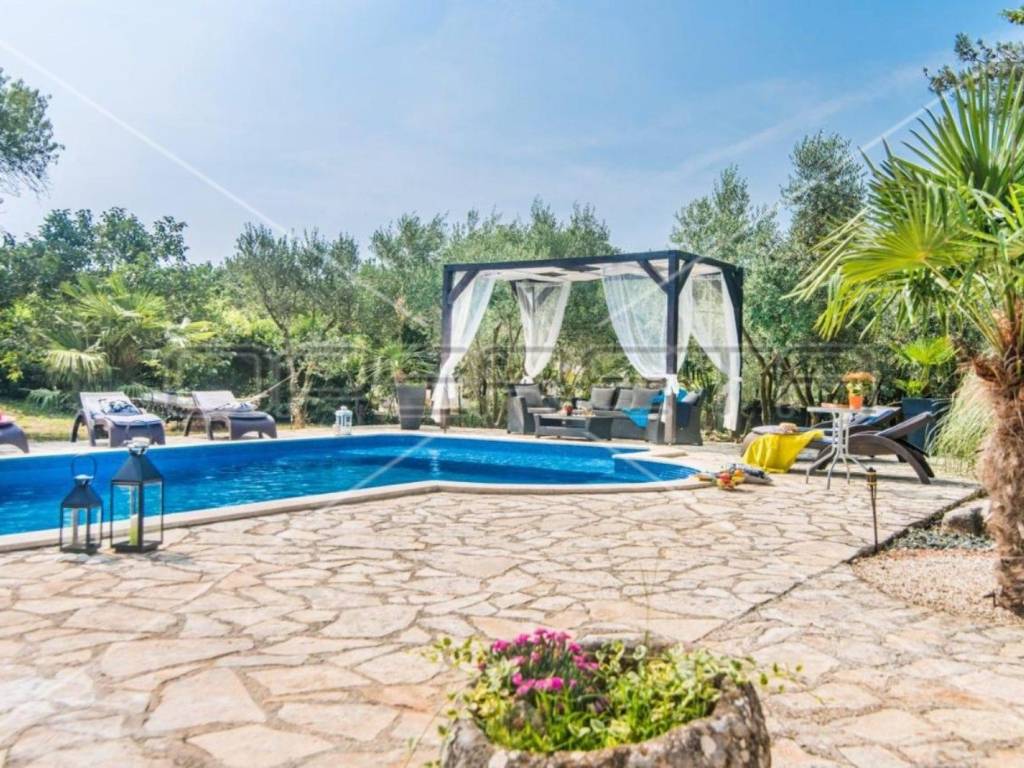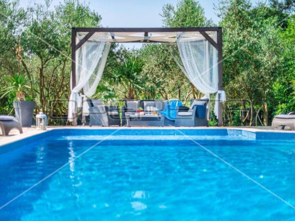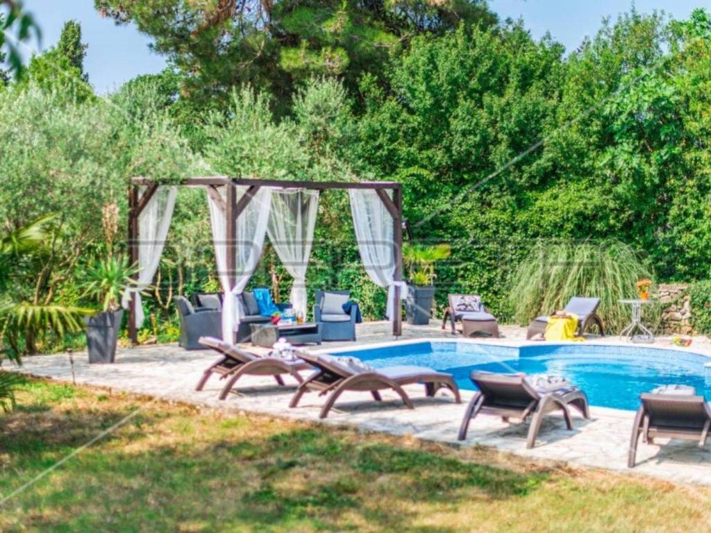 The garden is completely fenced and decorated with various plants and trees, a 36 m2 swimming pool with a sunbathing area in complete privacy.