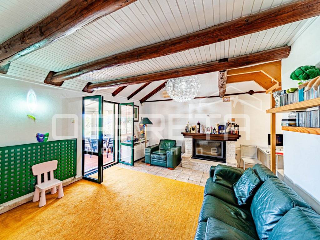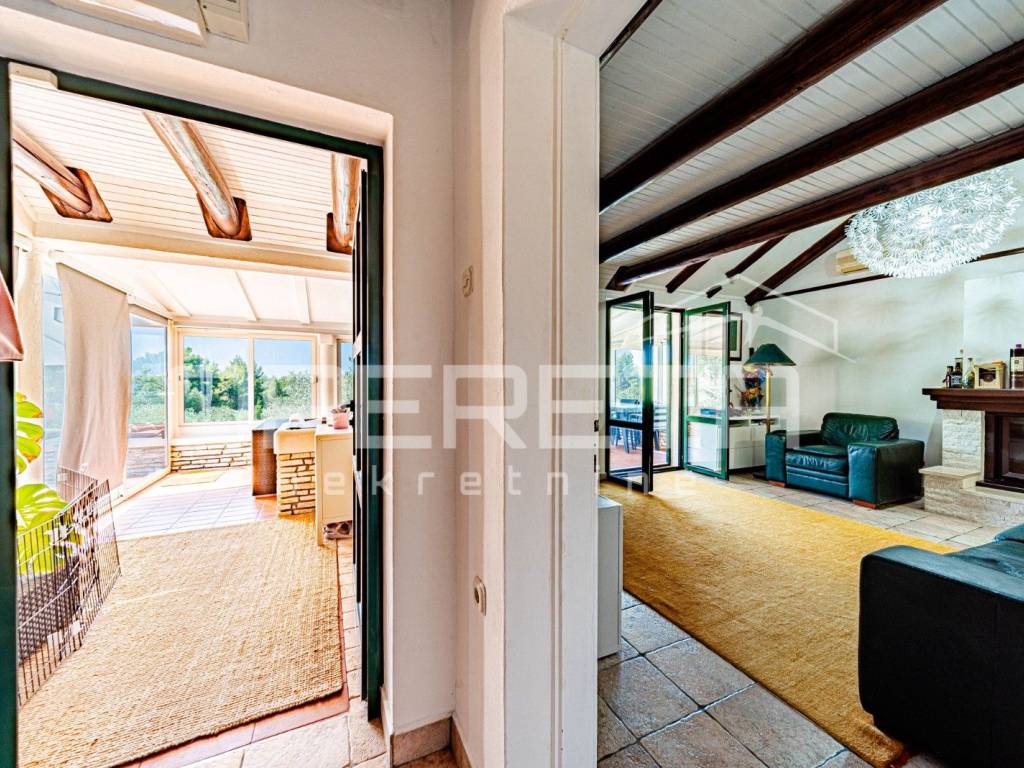 The enclosed terrace opens to a spacious outdoor terrace equipped with a jacuzzi and a premium barbecue area perfect for relaxation and entertaining. Below the house is a garage, a covered terrace for outdoor gatherings, and a heated swimming pool of 36 m, expanding the enjoyment of the outdoor space.