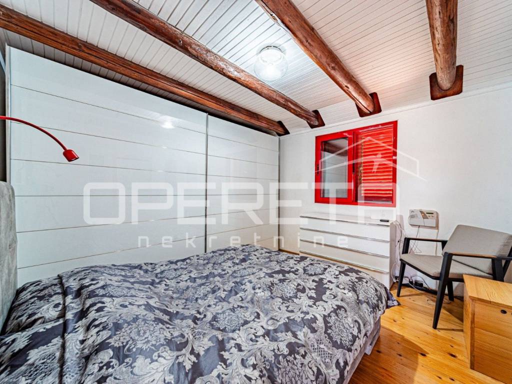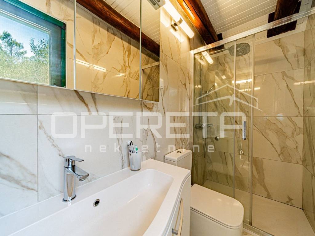 On a plot of 2,914 m, enclosed by traditional stone drywalls and carefully landscaped gardens, sits a house with a net living area of approximately 100 m, spread over two levels. The ground floor features a modern kitchen with a dining area, a bathroom, and the main bedroom, while the living room seamlessly connects to a closed terrace via a large, high-quality glass wall, allowing for abundant natural light and unobstructed views of the surrounding nature. The upper floor includes a childrens room, ideal for kids and family living.