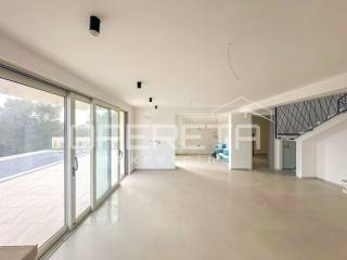 On the upper level (ground floor), there are two more bedrooms, two modern bathrooms, a walk-in closet, hallway, and an entrance terrace. A highlight is the terrace offering a fantastic panoramic sea view.