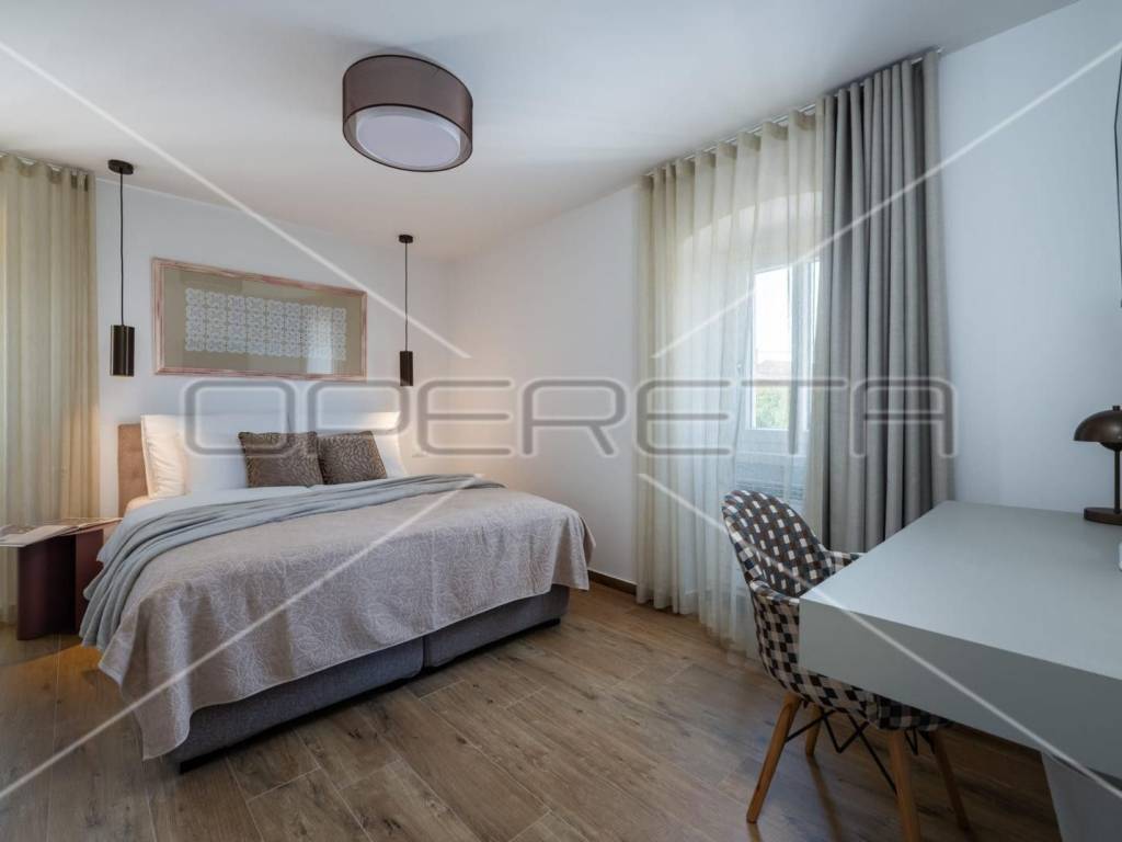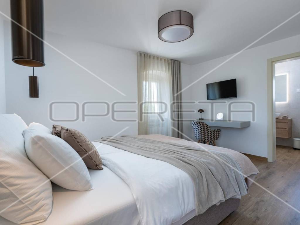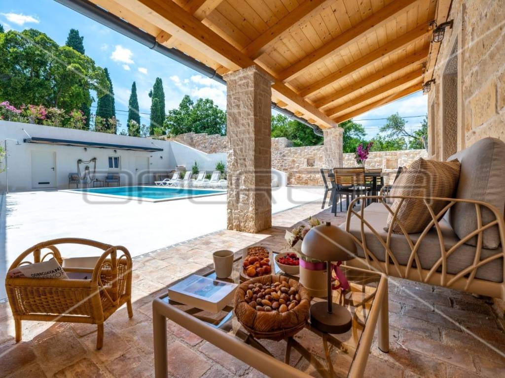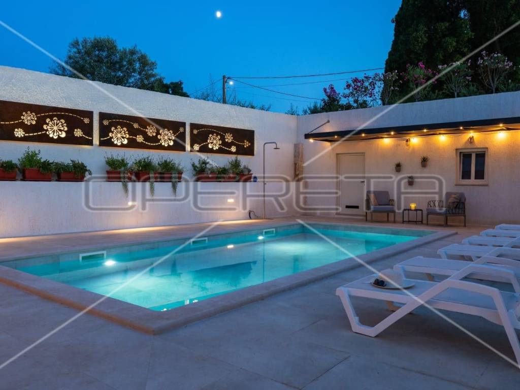 The exterior is divided into two levels; on the upper floor there is a parking lot with a charging station for electric cars, stone steps lead to the lower part where there is a garden with Mediterranean plants, a swimming pool of 32 m2 on the principle of electrolysis with hydromassage (with preparation for heating), a sunbathing area with deck chairs, an outdoor shower, and auxiliary a building with a boiler room and a storage room, as well as a kitchen and a toilet.