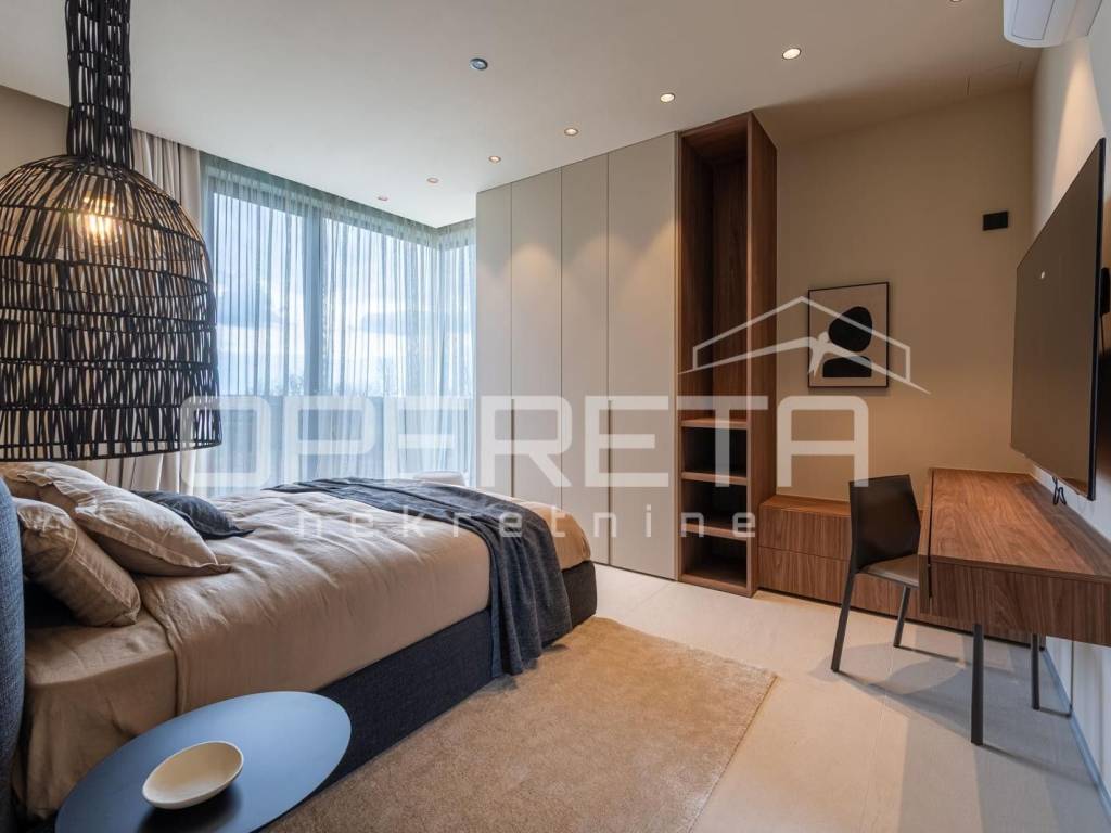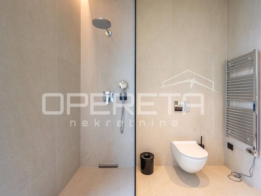 The villa is equipped with the most modern systems such as Smart Home technology, underfloor heating, optical internet, video surveillance, intercom, alarm and a heat pump that ensures optimal climate throughout the year. High-quality aluminum joinery with triple glazing, a flat roof and ceramic floor coverings further emphasize the contemporary architectural expression and energy efficiency.