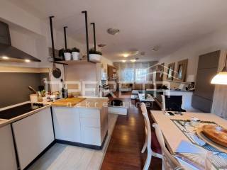 Prizemlje čini dvosoban stan s prostranim open space dnevnim boravkom, blagovaonicom i kuhinjom te izlazom na vrt u stražnjem dijelu dvorišta. Na istoj etaži nalaze se spremište, dodatna prostorija koja može služiti kao walk-in garderoba te kupaonica s WC-om.