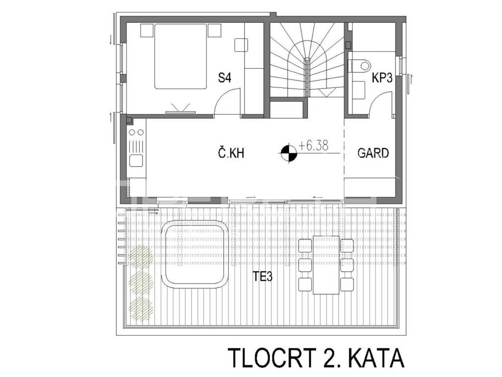 The first floor hosts three spacious bedrooms, two bathrooms, and a loggia, while the second floor has a fourth bedroom with bathroom and walk-in closet, as well as a roof terrace with a closed summer kitchen and a terrace with a jacuzzi (30 m).