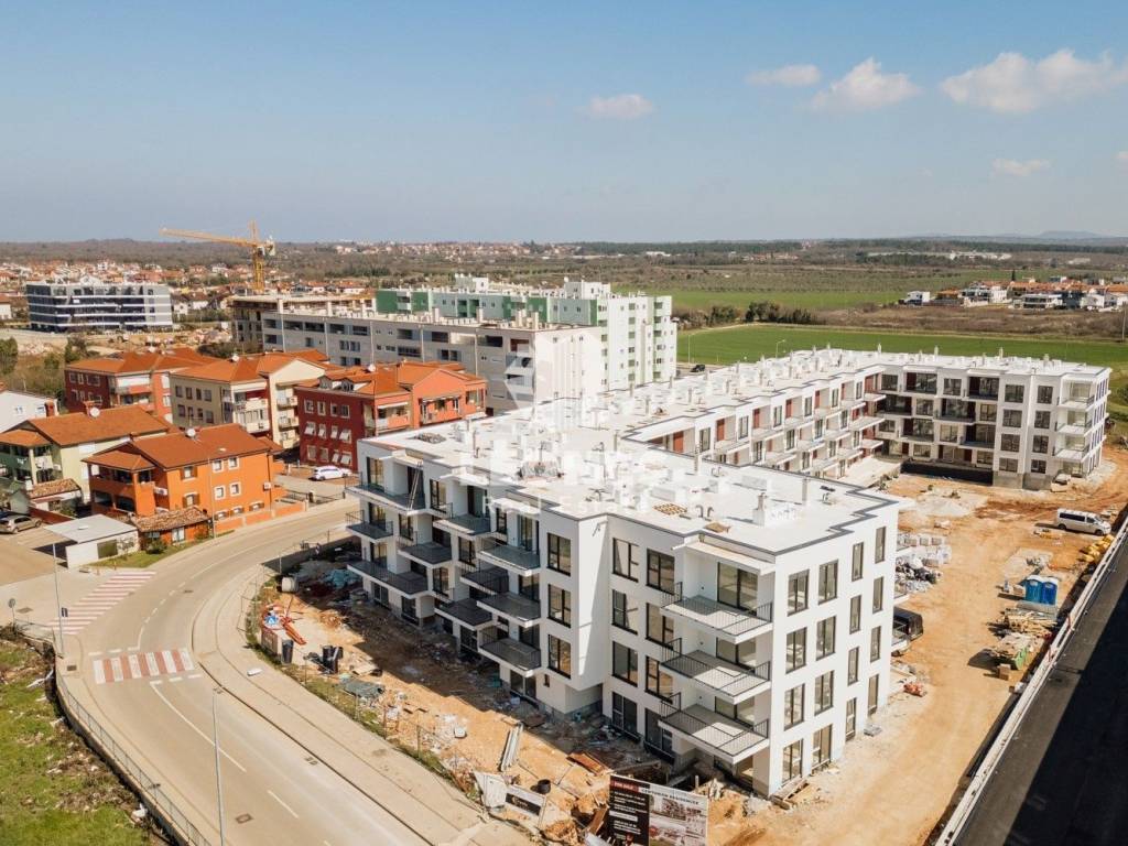 An apartment with covered parking space in a new building in Umag is for sale. The net usable area of the apartment is 52.80 m2. It consists of a living room and kitchen, bedroom, bathroom and loggia. It has a storage room of 2.60 m2 and one outdoor covered parking space.