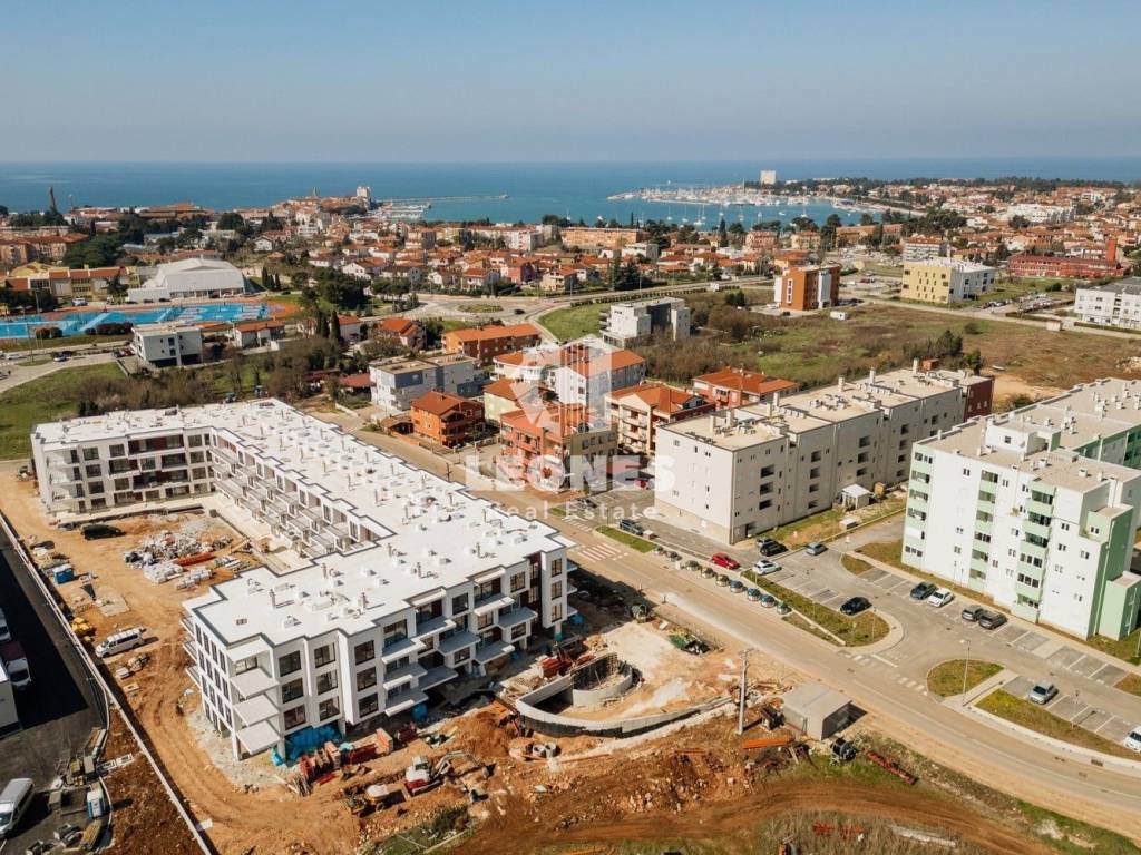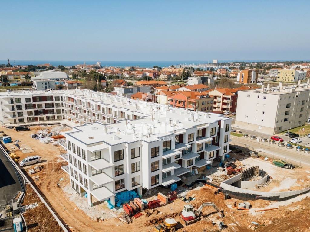 A spacious apartment with a large terrace in a quality new building in Umag is for sale. The net usable area of the apartment is 73.59 m2. The apartment is located on the second floor of a residential building and consists of a living room and kitchen, 2 bedrooms, bathroom, toilet and a large terrace of 15 m2. It has a storage room of 3.27 m2 and one garage parking space and one outdoor parking space.